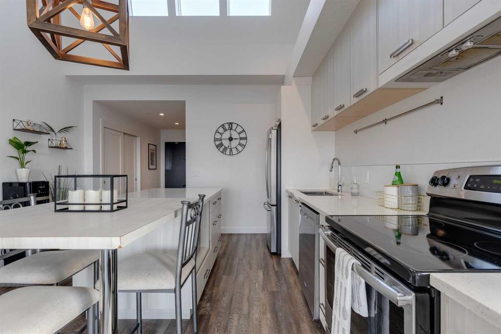 Meet “Ray” - Unbelievable Downtown View | South Exposure | Vaulted Ceilings | Titled Parking. Soak in one of Calgary’s very best downtown views from this stylish end unit in LiFTT located in the heart of Renfrew. With a coveted south exposure, soaring vaulted ceilings, and skylights, this home is flooded with natural light all day. The bright living room frames the skyline like artwork, and the private balcony is a prime vantage point to watch the city glow—unobstructed views stretching from sunrise to nightfall. Inside, you’ll find durable vinyl plank flooring and a modern kitchen with quartz countertops, ample cupboard space, and a built-in eating area. As a bonus, there's a gas line behind the stove. The spacious bedroom features a walk-through closet leading to a sleek 4-piece bathroom, while the large laundry/storage room provides rare extra space. Additional perks include underground titled parking and a separate storage locker. Located at 730 5 St NE, you’re just steps from Renfrew’s best restaurants, cafes, and amenities—Namo Cafe, SS106 Aperitivo Bar, Blue Star Diner, UNA, breweries, fitness studios, and easy access to the river pathways and downtown. A one-of-a-kind inner-city condo that blends modern design, practical space, and a show-stopping view.