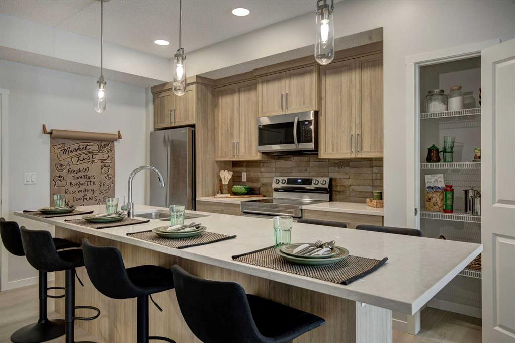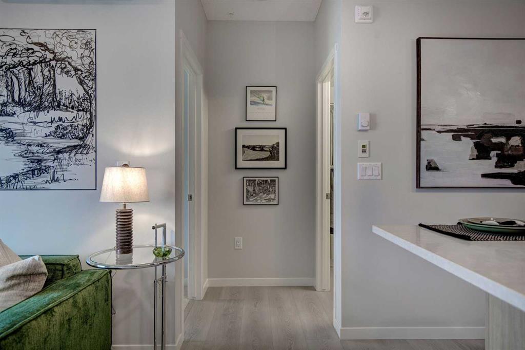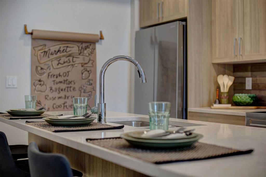 INTRODUCING GLACIER RIDGE, IN BEAUTIFUL NORTHWEST CALGARY. BUILT BY CEDARGLEN LIVING, WINNER OF THE CustomerInsight BUILDER OF CHOICE AWARD, 5 YEARS RUNNING! BRAND NEW "GR04" unit with high-spec features. You will feel right at home in this well thought-out TOP FLOOR, 651.0 RMS sq.ft. 1 bed, 1 bath home with open plan, 9' ceilings, LVP flooring throughout (NO CARPET), Low E triple glazed windows, BBQ gas line on the patio, Fresh Air System (ERV), and so much more. The kitchen is spectacular with full height, two tone cabinets, quartz counters, upgraded bank of drawers for pots and pans, undermount sink, rough-in water line to the fridge and S/S appliances. The island is extensive with built in flush breakfast bar, which transitions into the spacious living area, perfect for entertaining. The spacious primary bedroom has a large bright window (triple pane windows) and sizeable walk-in closet. Right beside your bedroom is a 4pc bath with quartz counters, upgraded tiles to the ceiling, and undermount sink. Nearby is the spacious laundry/storage room, this is a must see (washer & dryer included). Highlights include: Hardie board siding, designer lighting package, sound reducing membrane to reduce sound transmission between floors, clear glass railing to balconies and 1 titled underground parking stall included. A once in a lifetime community in Northwest Calgary. Framed by views of the Rocky Mountains and distinguished by natural coulees that cross the land, Glacier Ridge offers a rare chance for families to live in a new community. PET FRIENDLY COMPLEX, PRE-CONSTRUCTION OPPORTUNITY (drywall stage) and PHOTOS ARE OF A DIFFERENT SHOW SUITE FOR REFERENCE ONLY, FINISHING'S/PLAN WILL DIFFER. ESTIMATED COMPLETION IS DECEMBER 4, 2025. VISIT THE SHOW SUITE TODAY FOR MORE INFO!