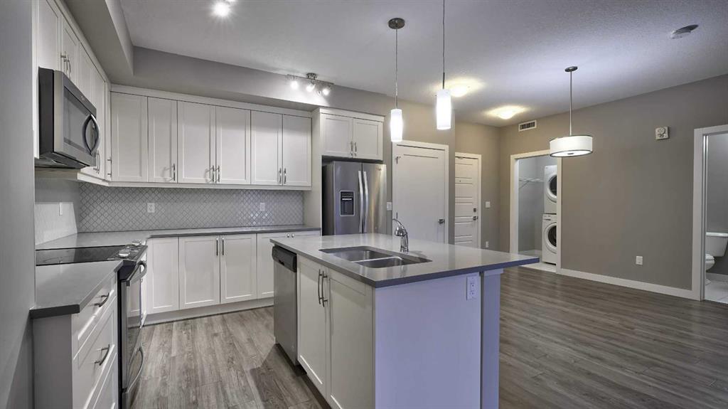 Available Immediately. Top-floor 2-bedroom, 2-bathroom unit in the highly sought-after Auburn Bay Lake Community — a rare opportunity to enjoy true privacy with no neighbours above you. This bright and inviting home features a large east-facing balcony that extends your outdoor seasons and fills the interior with morning light. From the moment you walk in, you’ll appreciate the 9 ft ceilings and abundant natural light that create a spacious, airy atmosphere. The open-concept layout easily accommodates a full dining table and is ideal for both everyday living and entertaining. The kitchen is a chef’s delight, featuring gleaming white cabinetry, stainless steel appliances, stone countertops, a designer tile backsplash, and a generous island perfect for meal prep and casual dining. The primary bedroom is a serene retreat with a walk-in closet and a well-appointed ensuite offering dual sinks and an easy-access shower — ideal for those seeking comfort and convenience while downsizing. The second bedroom is impressively large and positioned on the opposite side of the unit, providing excellent privacy for guests or family members. A full second bathroom with a bathtub and in-suite laundry add to the functionality of this well-designed floor plan. You’ll love the security and convenience of underground heated parking and an additional storage locker. The building’s contemporary architecture and clean design enhance the overall appeal. As an Auburn Bay resident, you’ll enjoy year-round lake access included through HOA fees. The lake offers swimming, fishing, paddleboarding, skating, and a wide range of adult and youth programs. Additional community amenities include tennis courts, picnic shelters, a gymnasium, and even a disc golf course. The location is exceptional — just one block from everyday essentials and fitness options in Auburn Station, and only minutes to Seton’s vibrant Gateway Retail District featuring restaurants, major retailers, Superstore, Cineplex VIP Cinemas, the South Health Campus, YMCA, and the public library. Plus, you’ll appreciate easy access to schools, public transit, and major routes such as 52nd Street, Stoney Trail, and Deerfoot Trail. The Auburn off-leash dog park is also just a short drive away.