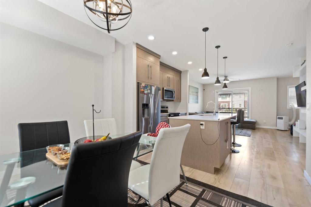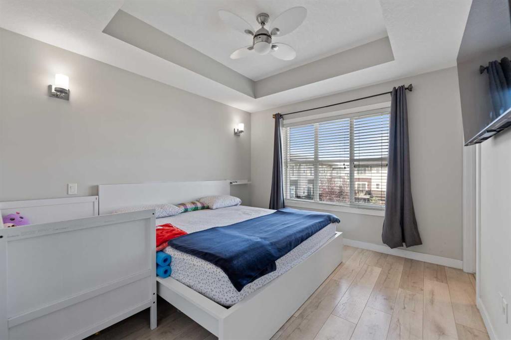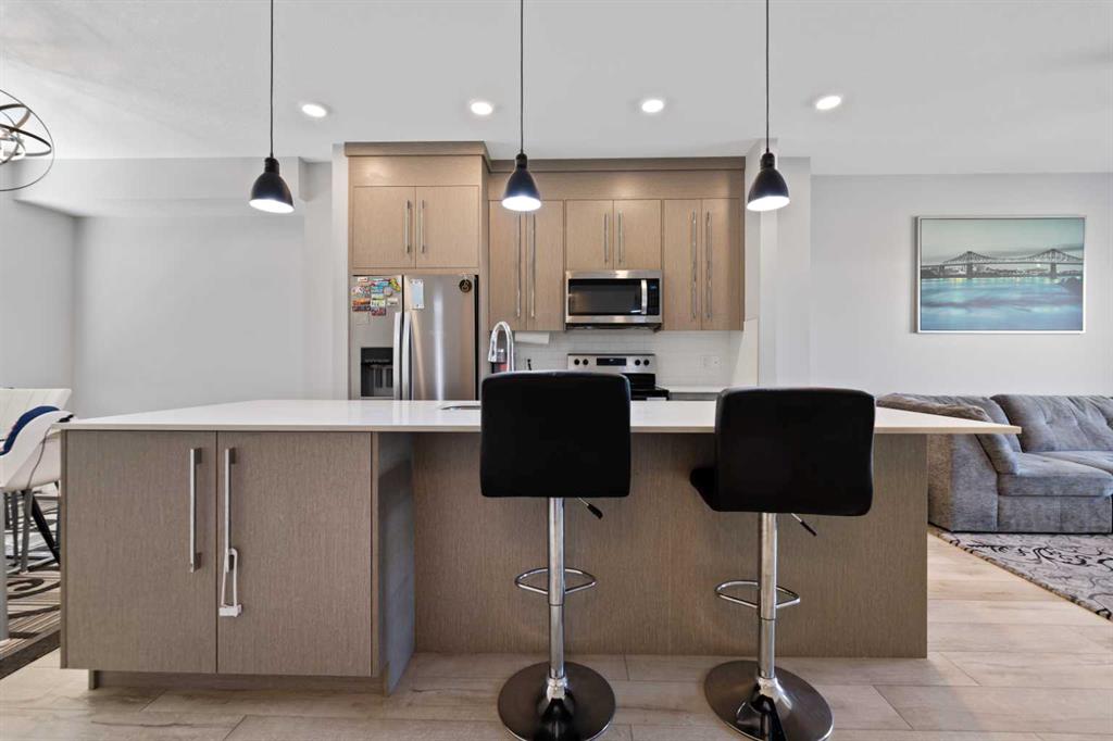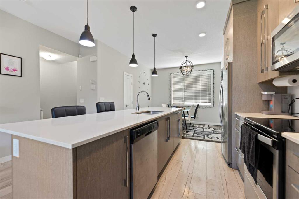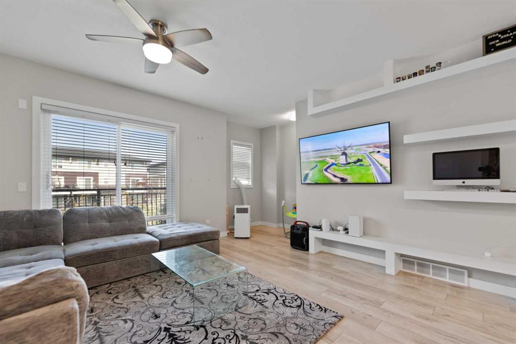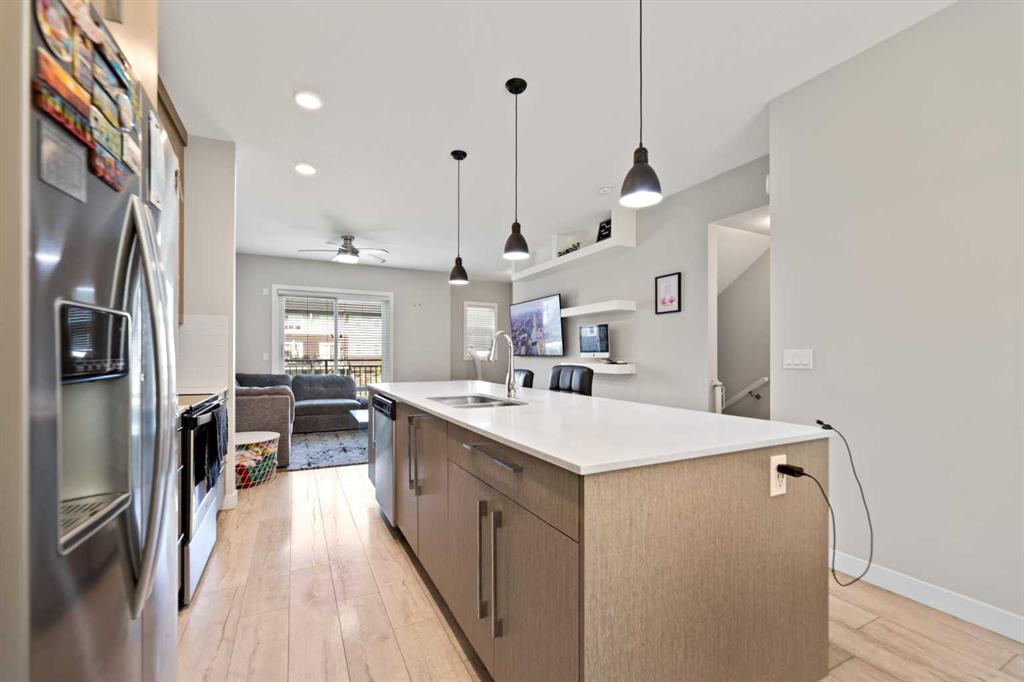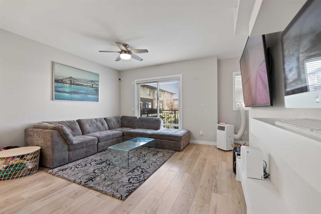 Welcome to this bright and spacious 4-bedroom, 2.5-bath townhome in the vibrant, family-oriented community of Cornerstone NE. Thoughtfully designed and flooded with natural light thanks to extra windows, this home offers the perfect blend of comfort, function, and community charm. The main floor features a large, open-concept living area with built-in shelving—great for keeping things stylish and organized. The kitchen is a standout with sleek quartz countertops, plenty of prep space, and a seamless flow into the dining area, ideal for hosting or family dinners. Step outside onto the large balcony that overlooks a peaceful courtyard where kids play and neighbours gather—bringing the heart of this friendly community to life. A bonus bedroom, playroom or home office on the main level offers flexibility for growing families or those working remotely. Upstairs, you'll find three well-sized bedrooms, including a generous primary suite with tray ceilings, a walk-in closet, and a four-piece ensuite. Fresh new carpet throughout adds a cozy touch, and the double attached garage means convenience is always at your doorstep. With schools, parks, shopping, and public transit just minutes away, this home offers everything you need for daily life and long-term value. Whether you're a growing family, first time home buyer or a savvy investor, this one checks all the boxes. Come see the space, feel the light, and picture yourself at home in Cornerstone