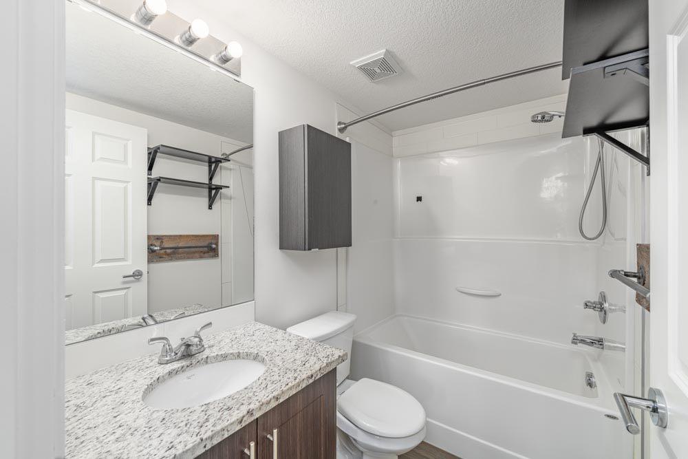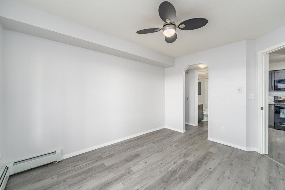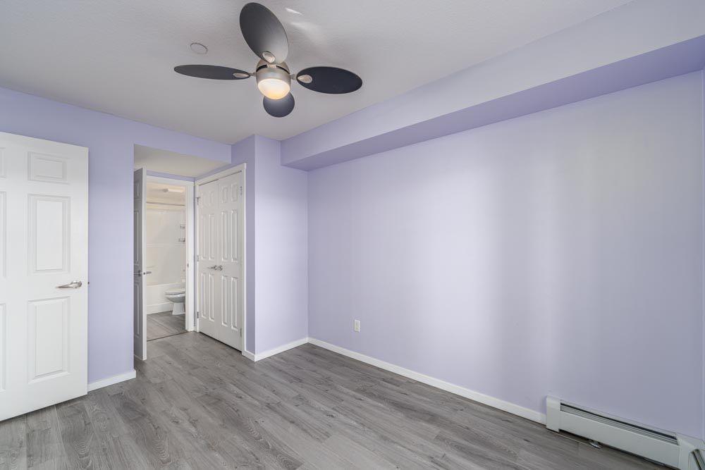 Inside, brand-new luxury vinyl plank flooring ties together a bright open-concept plan. The modern kitchen offers quartz countertops, full-height cabinetry, and a central island that opens to the living area so the natural outlook stays front and center when you cook, host, or unwind. The primary bedroom includes a private 4-piece ensuite and walk-in closet; the second bedroom has convenient access to the main 4-piece bathroom, which also functions as a guest bath from the hallway - a flexible setup for family, visitors, or a home office.
