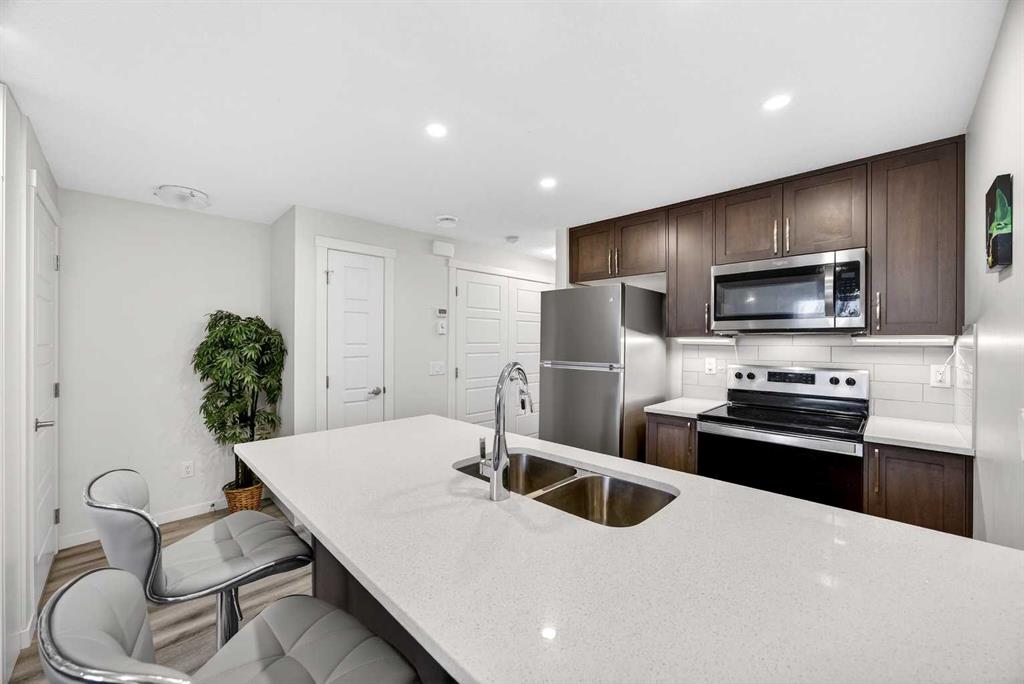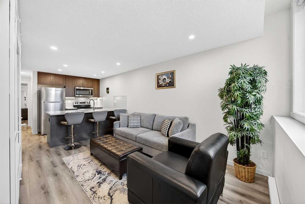 Step into modern, maintenance-free living in the vibrant community of Rockland Park. This well-designed one-bedroom, one-bathroom townhome offers approximately 516 sq. ft. of functional space and a generous 178 sq. ft. patio, making it an excellent opportunity for first-time buyers, downsizers, or investors (short-term rental/AirBnB allowed). Tucked into a quiet corner of the ZEN complex, this home enjoys a peaceful setting with scenic views toward the nearby pond, green space and serene pathways. Inside, the open-concept layout creates a comfortable flow between the living area and kitchen, maximizing every square foot. The kitchen is both stylish and practical, complete with full-size stainless steel appliances, quartz countertops, sleek cabinetry, a pantry closet and a convenient eating bar. The bedroom is bright and efficiently laid out, featuring his-and-hers closets, while the four-piece bathroom is finished with matching quartz surfaces. In-suite laundry with a full-size washer and dryer adds everyday convenience. This unit also includes durable laminate flooring throughout, recessed lighting, a private front gated patio for fresh air, and an assigned powered parking stall. Its main-floor entrance level offers easy access with minimal stairs. Located just steps from walking paths and the community pond, and close to the residents’ centre with planned amenities such as an outdoor pool, hot tub, pickleball/basketball courts and child care. This home is perfectly positioned to enjoy everything Rockland Park has to offer. With quick connections to major routes like Stoney Trail, Crowchild Trail, and the Trans-Canada Highway, commuting and weekend getaways are effortless. A fantastic opportunity to own in a growing northwest community—don’t miss it.