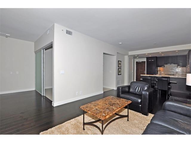Welcome to one of the hottest locations in Calgary! Steps to Princess Island river path system, restaurants, shops and downtown. Executive style and top quality finishes in this 690 sqft, one bedroom plus den condo. This contemporary condo has features that will thrill the most discriminating buyer. 9' flat painted ceilings, gourmet kitchen with upgraded stainless steel appliances including gas cooktop, built-in oven and sub zero fridge with freezer drawers, granite countertops, new vinyl plank floors, sleek gas fireplace and fresh paint throughout. Flexible opaque garage door walls open up views and create a den or to expand the master bedroom. Lots of options here! This 4th floor condo looks east with a view of the river and Centre Street bridge. Building amenities include a gym with yoga studio, steam room & hot tub, games room & private movie theatre. 24 hour concierge service is available.