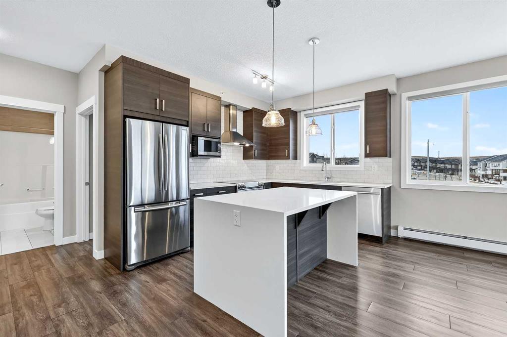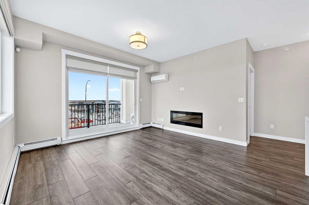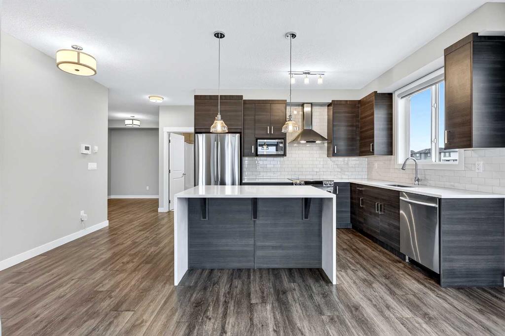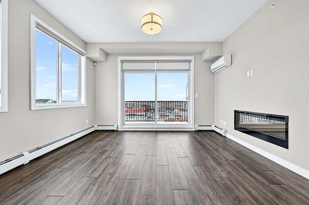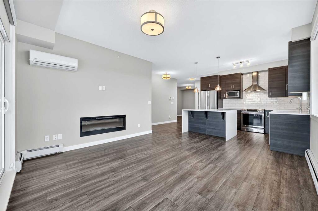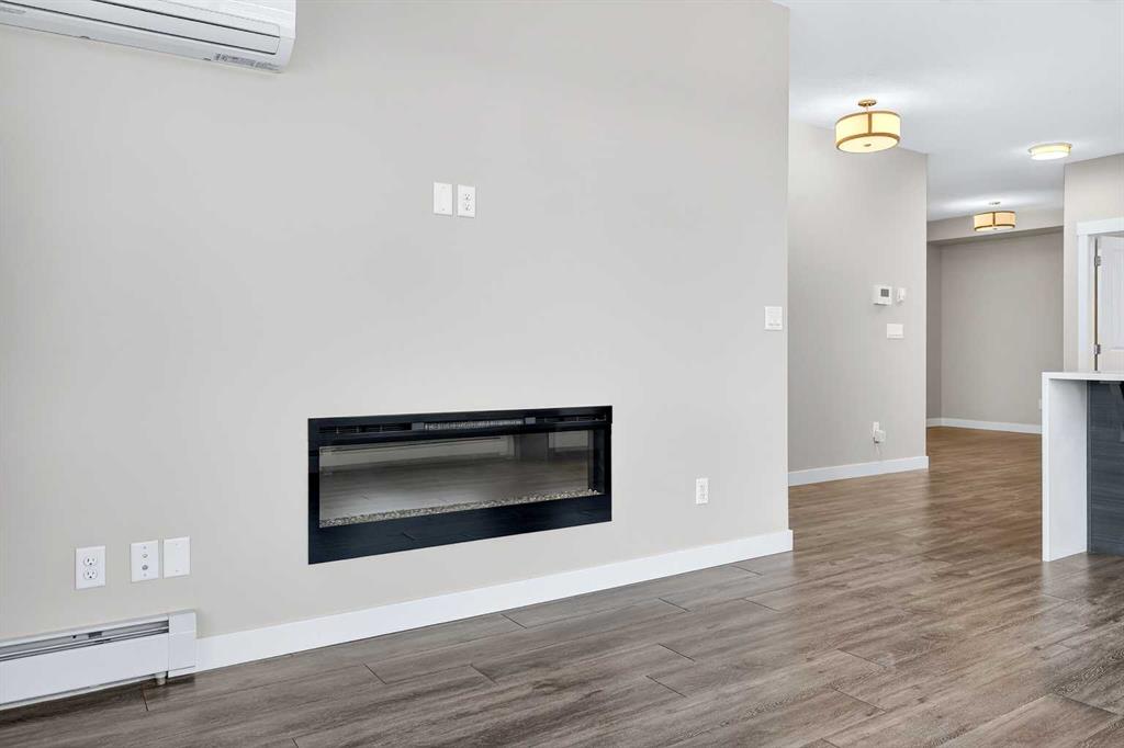 The open-concept living and kitchen area forms the heart of the home, anchored by an upgraded oversized island—ideal for everyday living and effortless entertaining. Finished with luxury vinyl plank flooring, a premium appliance package, and clean contemporary lines, the kitchen balances style with functionality. The living area is warmed by a sleek electric fireplace, creating a welcoming atmosphere year-round.