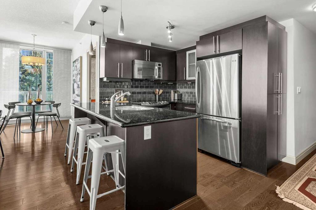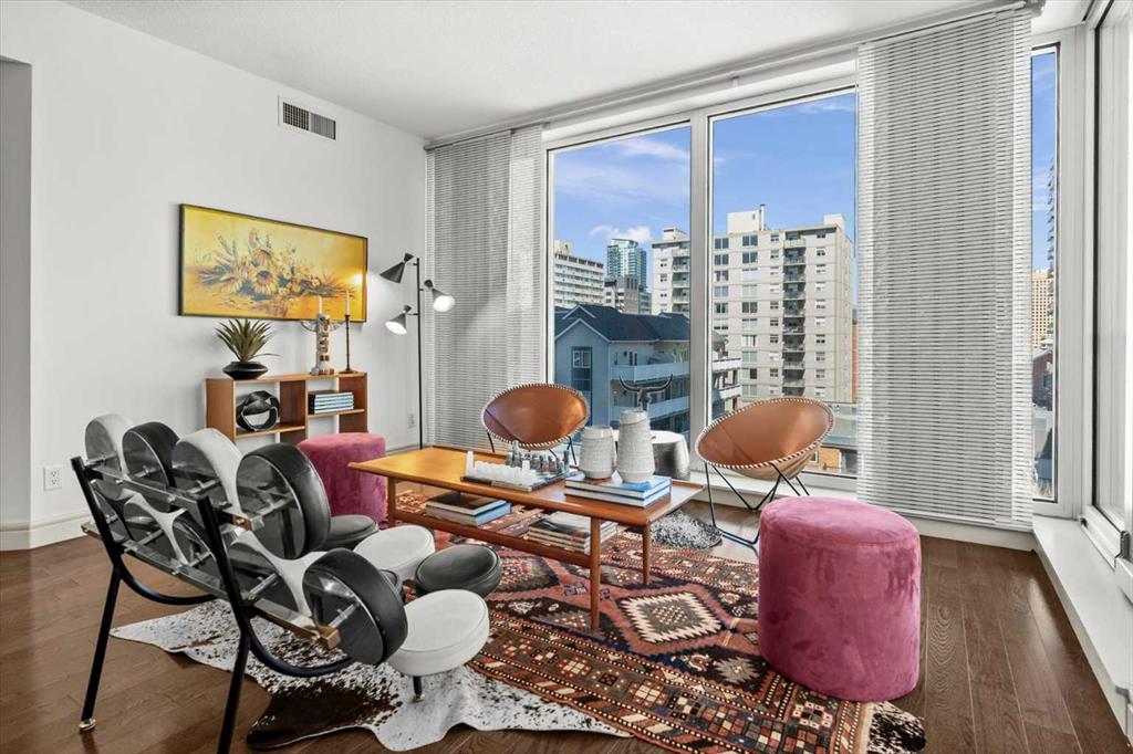 Bright, quiet, and impeccably positioned on the 5th floor, this nearly 900 sq ft corner suite offers a refined urban lifestyle in one of Calgary’s most sought-after inner-city locations. Featuring two bedrooms and two full bathrooms, the home strikes a rare balance between downtown energy and everyday tranquility, sitting just steps from the excitement of 17th Avenue while staying thoughtfully set back from the bustle of city life. Living here means embracing a truly walkable lifestyle. Start your mornings with coffee from a nearby café, pick up groceries or fresh produce just around the corner, or head to your favourite yoga studio or boutique gym, all without ever needing your car. Commuting is effortless, whether you work downtown, attend meetings across the core, or rely on nearby transit routes for easy access throughout the city. In the evenings, stroll to award-winning restaurants, lively patios, cocktail lounges, and local boutiques, then return home to a peaceful retreat elevated above the street. Inside, the open-concept layout is flooded with natural light thanks to floor-to-ceiling windows and a desirable corner orientation. Hardwood floors, central air conditioning and heating, in-suite laundry, and a thoughtful split-bedroom design create a space that feels both stylish and highly functional. The primary bedroom offers excellent privacy with a generous closet and a well-appointed ensuite, while the second bedroom and full bathroom are ideally positioned for guests, roommates, or a dedicated home office. Step onto the private balcony off the living room and enjoy your own outdoor space, complete with a gas BBQ hookup…perfect for relaxed evenings, summer grilling, or entertaining friends before heading out on 17th Ave. The home also includes titled underground parking and a separate storage locker, adding everyday convenience and peace of mind. The Montana is a standout building in Calgary’s urban landscape, known for its timeless architectural design and quality concrete construction that provides superior soundproofing and long-term value. Residents enjoy a low-maintenance, luxury lifestyle with a 7-day concierge, a newly updated fitness centre, and condominium fees that include heat, water, insurance, and more. Beautifully maintained and move-in ready, this residence is ideal for professionals, downsizing, or urban enthusiasts seeking sophisticated downtown living without compromise. This is a home that truly complements the vibrant, connected lifestyle that downtown Calgary is known for.