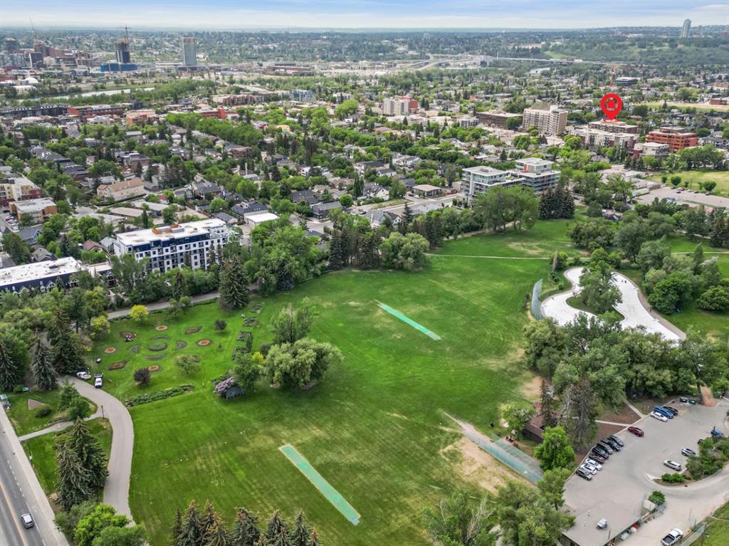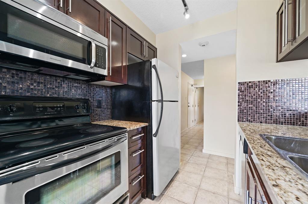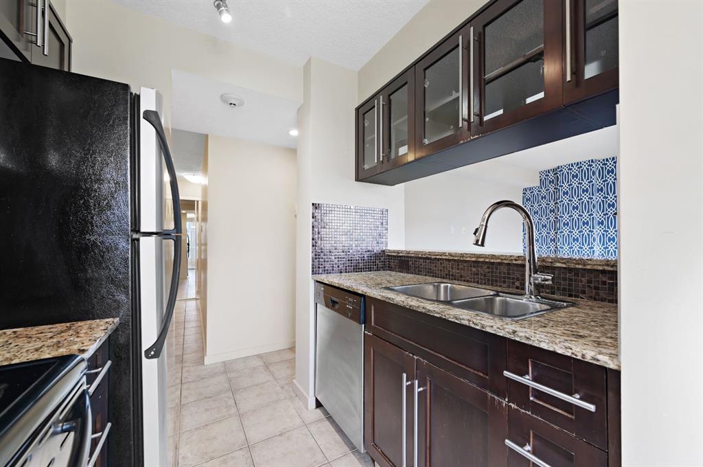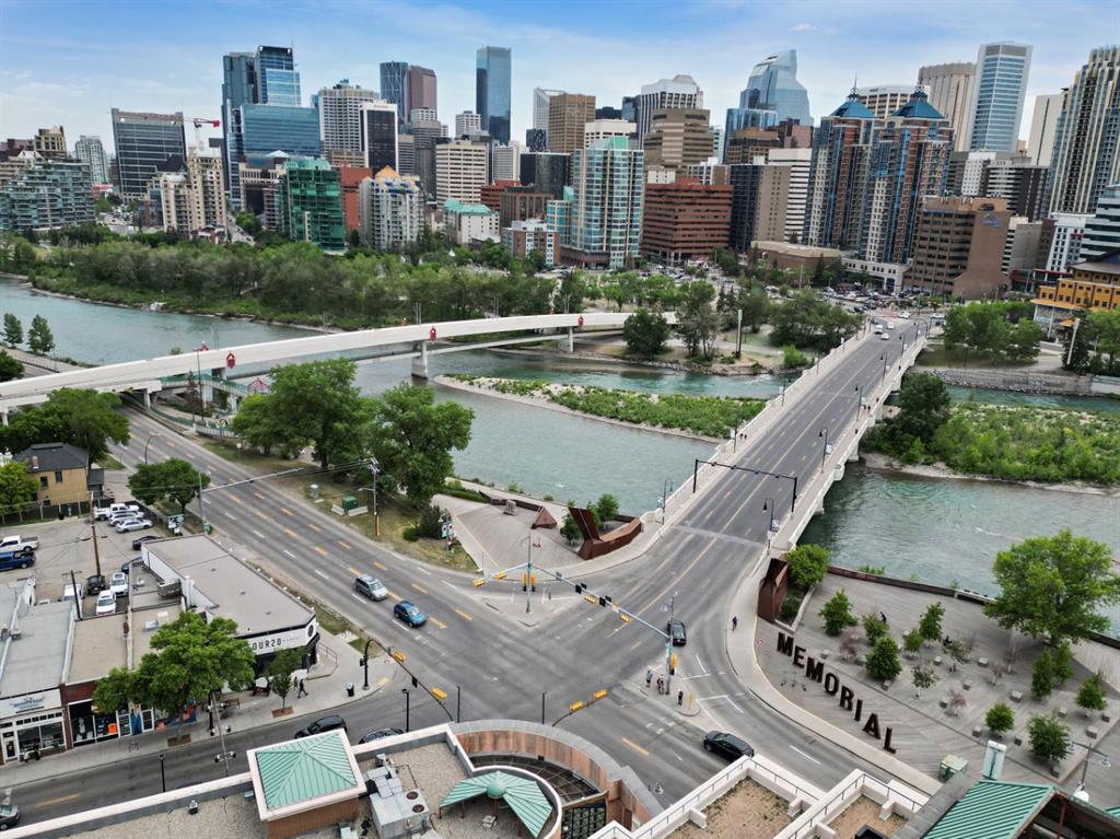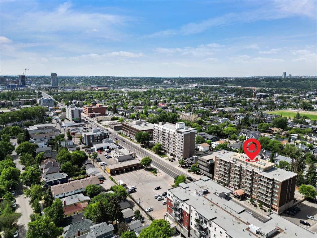 This corner END unit showcases fantastic CITY SKYLINE VIEWS and must be seen. Very close to the downtown core in the heart of Hillhurst, and walking distance to the pubs, restaurants, and shops of Kensington. Stroll to the walking paths along the Bow River, beautiful Riley Park, and the Sunnyside LRT station and even up the hill to SAIT! In a concrete building, this 1-bedroom condo features a kitchen perfect for entertaining with eating bar, stainless steel appliances, granite countertops, mosaic tile backsplash, and darker stained cabinetry, a 5-piece bath with jetted tub and granite counters, cozy living room, IN-SUITE laundry, parking stall (#31) and separate private storage area (#31). The bedroom is separated from the living room and eating area for privacy and quiet. The Vue building offers a fully equipped exercise room with newer equipment and bike storage! The very low condo fee ($436/month) includes heat and water and sewer. Experience the great location, style and convenience of this condo and the Kensington area. Priced to sell.