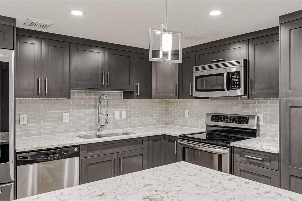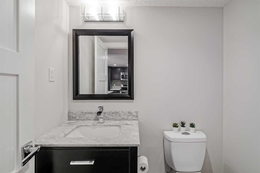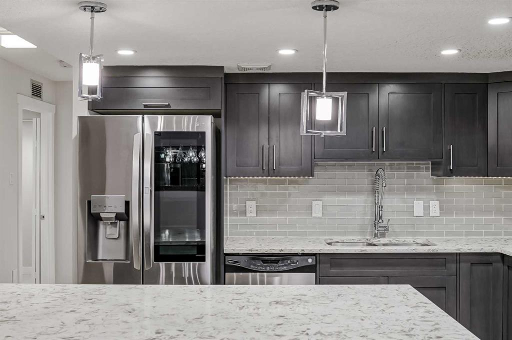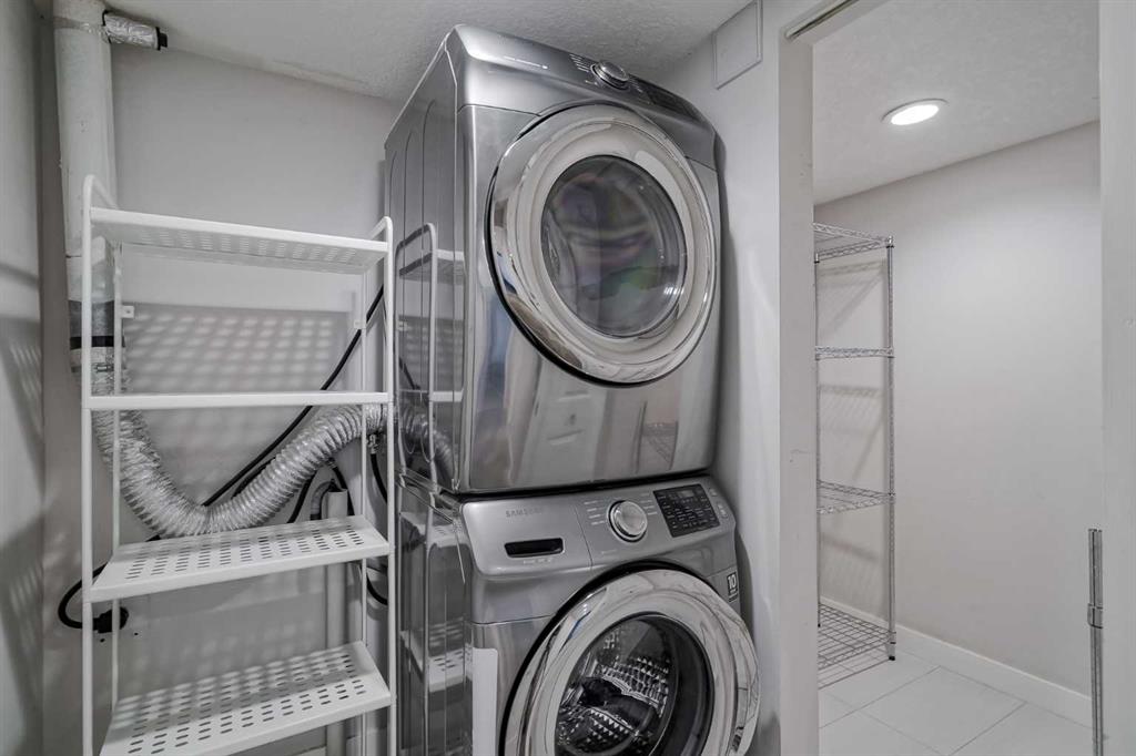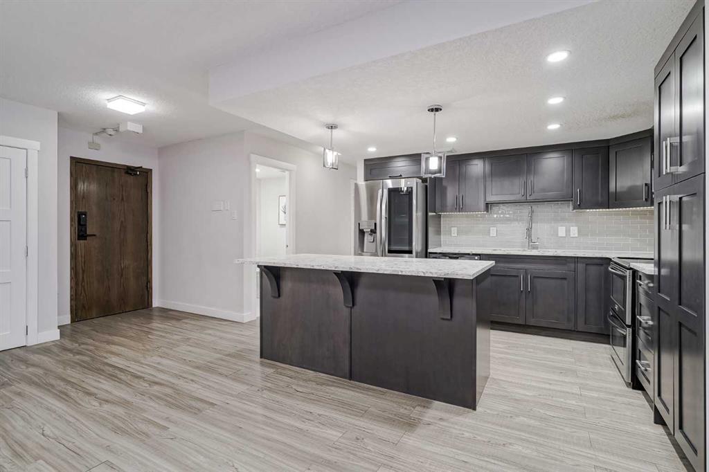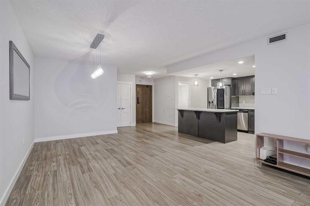 From the moment you enter, you are greeted by the openess of the condo. Laminate flooring which extends throughout the main living areas, creating a modern yet cozy feel. Expansive windows flood the space with natural light and frame breathtaking views of Calgary's downtown skyline, creating a spectacular backdrop for quiet evenings and entertaining guests alike. The spacious living and dining areas flow effortlessly into a renovated kitchen with high-end stainless steel appliances, perfect for hosting dinners or casual gatherings.