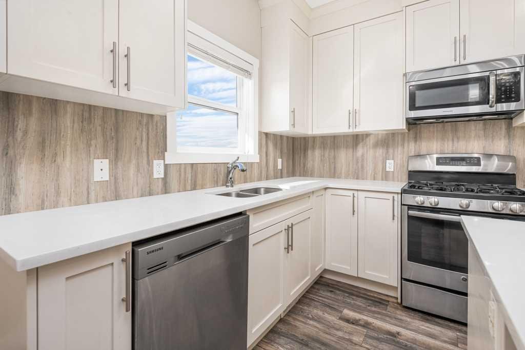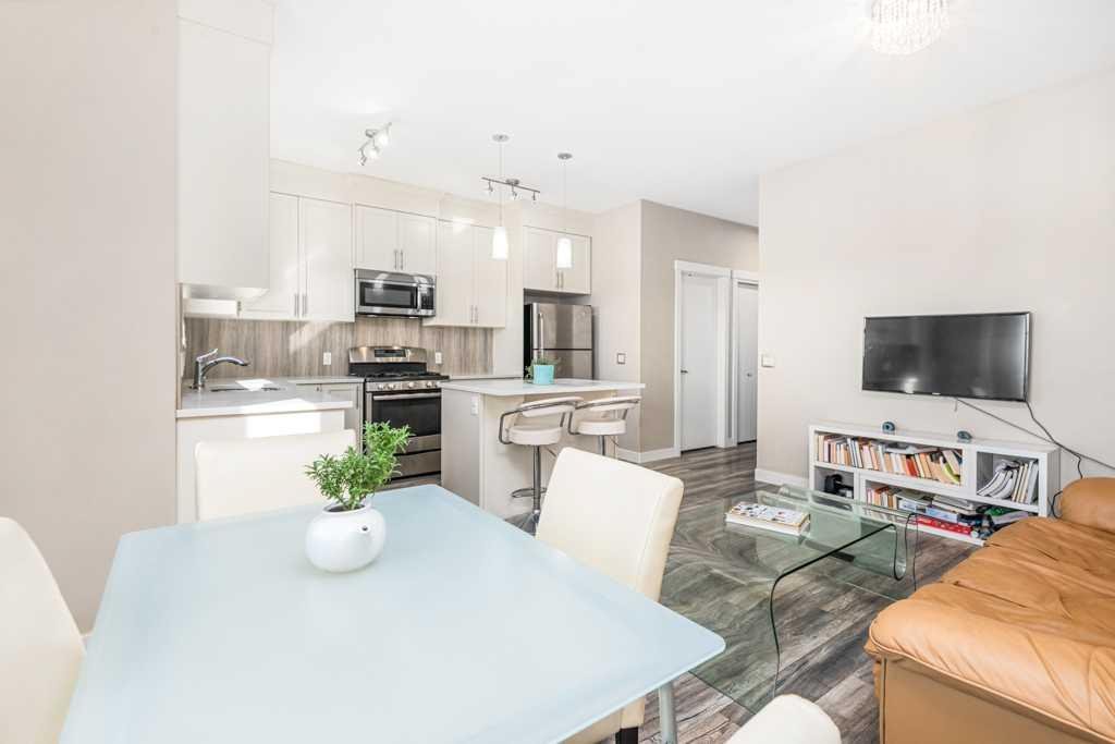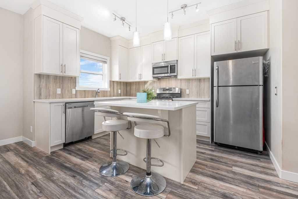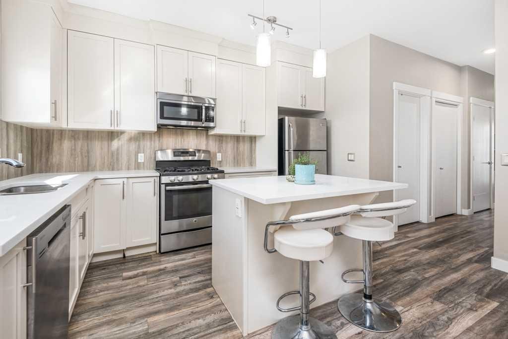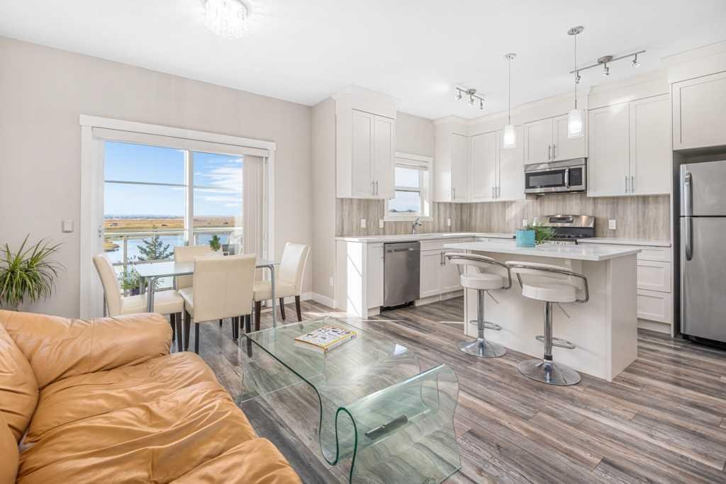 Step inside to discover soaring 9-foot ceilings and a bright open-concept main floor perfect for entertaining. The chef-inspired kitchen features upgraded 42” cabinetry, quartz countertops, a gas range, stainless steel appliances, and a generous island—ideal for casual dining and hosting. Step out onto your west-facing balcony, complete with gas line—perfect for BBQs and enjoying sunset views over the pond and Rockies.
