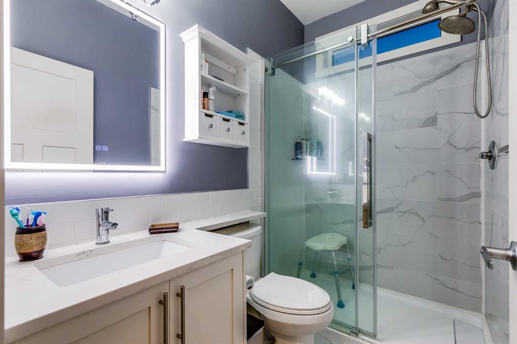 ***MODERN AIR-CONDITIONED CORNER UNIT!*** Step into this bright and open concept, former show home with 2 primary bedrooms, PLUS Office/Den/Guest bedroom on the main floor, 2.5 bathrooms. The living room has a full feature REAL stone wall with a built-in custom cabinet and shelving unit. An elegant electric fireplace. The Kitchen has silver pearl granite countertops, a large island with an eating bar, a formal dining room. Perfect for relaxing and entertaining is the patio door off the dining room, with a natural gas line, which makes it the perfect outdoor space for BBQ, you’ll never have to run out for propane in the middle of cooking dinner ever again! The spacious upper level comes with a vaulted ceiling throughout the whole upper floor, it offers a generous bedroom, 4pc bathroom, a large primary bedroom with room for a king-size bed, a walk-in closet, and a 3pc ensuite bathroom comes with a heated tile floor to keep your toes warm after your shower, and upgraded vanity with quartz countertop. The laundry/storage room is also conveniently located on this level next to all the bedrooms. The whole house has upgraded décora light switches with added multiple dimmers switches, timers, smart switches and led lighting. The single attached garage has additional custom-built storage shelving units. This CORNER UNIT is perfectly located next to the street of Skyview Ranch Manor, which offers ample public street parking in addition to visitor parking space just next to the unit. With nearby school and shopping, this home has it all. Don’t wait, make this one yours today!