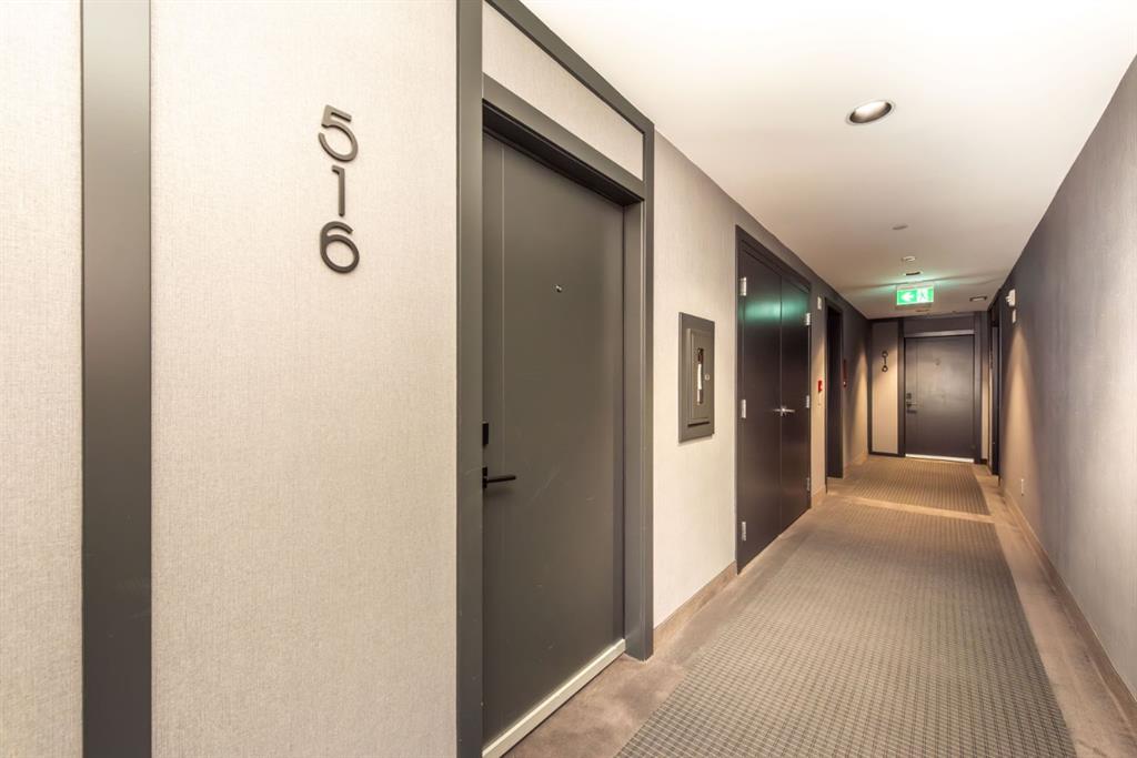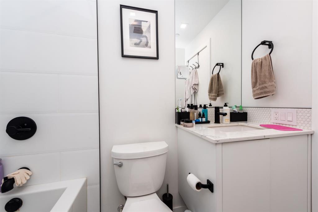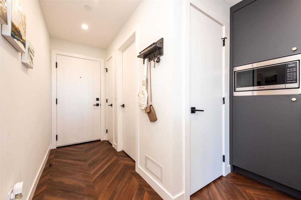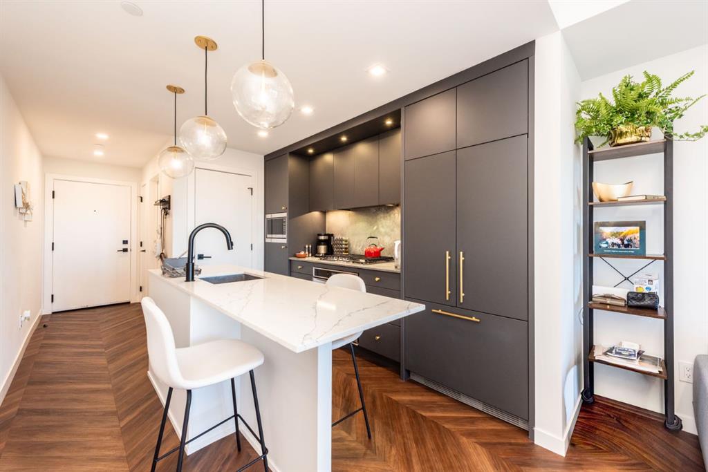 Floor-to-ceiling glass in the living room, 9’ ceilings, and LED pot lighting create a bright, modern atmosphere. The chef-inspired kitchen features quartz countertops, a gas cooktop, built-in microwave and oven, and custom soft-close cabinetry. Retreat to the bedroom with its expansive walk-in closet, and step out onto your private balcony with sweeping views.