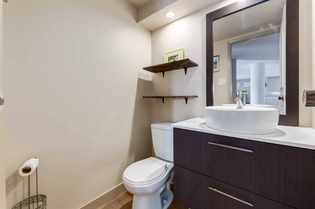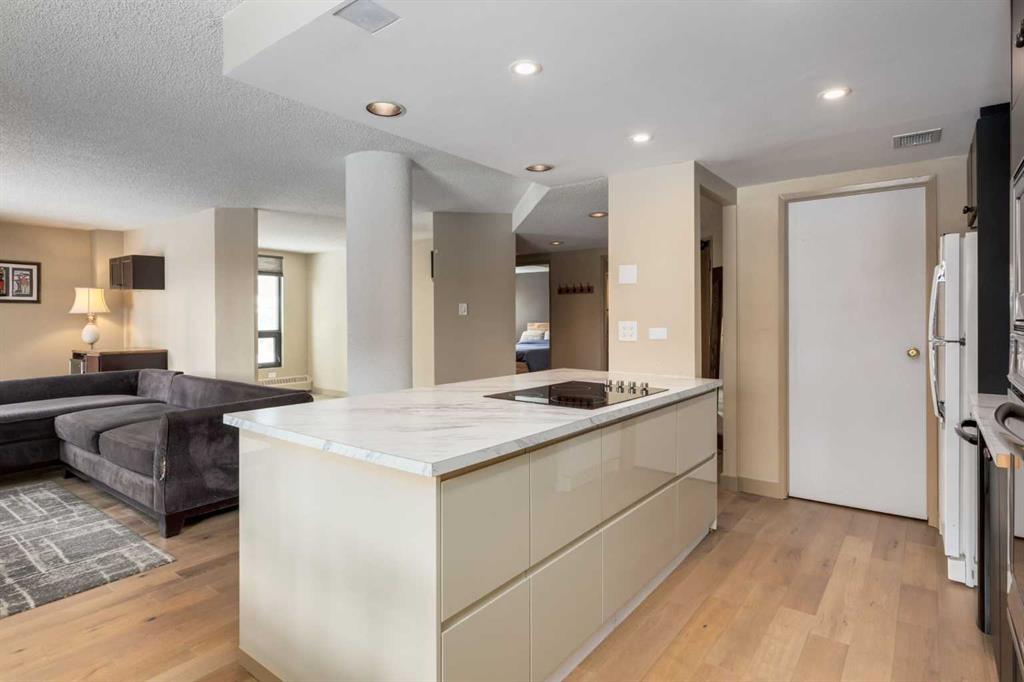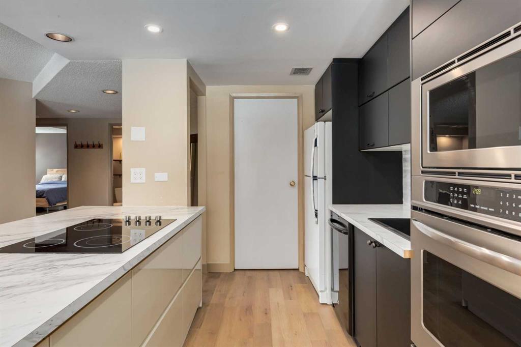 Priced to sell! Explore this beautifully updated condo featuring over 1,000 sq ft of stylish living space with laminate plank hardwood flooring throughout. At the heart of the great room is the kitchen with a spacious island, plentiful storage, and a convenient walk-in pantry. Sunlit west-facing windows brighten the dining area, and the family room flows to a sheltered balcony with fresh air and city views. The large primary bedroom includes dual closets and a sleek 3-piece ensuite. A versatile den or second bedroom, an additional full bathroom, and in-suite laundry add convenience to the layout. With a covered, gated parking stall for peace of mind, this condo is ideally located just steps from the lively shops and restaurants of 17th Avenue and offers easy access to schools, shopping, the Bow River pathway, public transit, and downtown. Experience the perfect blend of urban lifestyle and everyday comfort. Move-in ready and incredible value at this price point.