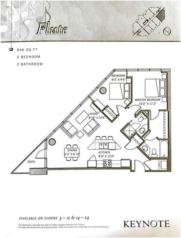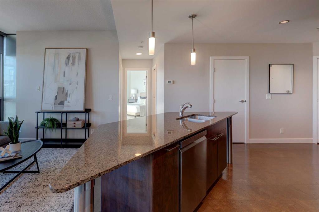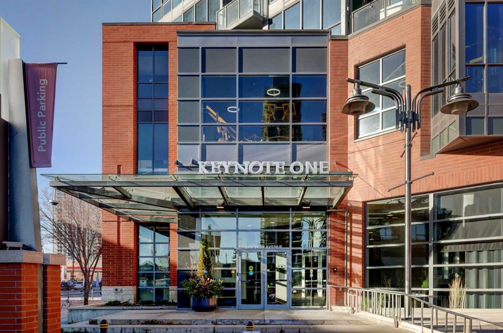 This upgraded 2-bedroom, 2-bathroom corner condo in the Keynote 1 building is move-in ready and waiting for you to call home. The open-concept layout connects the kitchen, dining area, and living room, with a prime east-facing view that creates an inviting space and an ideal place to entertain. It has been meticulously prepared for the new owner with freshly painted throughout (walls, doors, baseboard, trim, kitchen bulkhead), new plush carpet/underlay in the bedrooms, dishwasher (2023), washer and dryer (2025), primary bedroom closet organizer, light fixtures, and professionally cleaned. Other key features include floor-to-ceiling windows for maximum natural light and a front-row view of the Stampede fireworks, stainless steel appliances, granite countertops, central air conditioning in the main living area, a no-pet home, titled heated underground parking, titled storage locker, and concrete construction for superior sound-dampening and durability. Living at Keynote 1, you’ll have an on-site manager, access to the fully equipped fitness facilities (weights and cardio room), two guest suites, owner’s lounge with TVs, pool table, partial kitchen, BBQs, outdoor patio, plus 15 rooftop oasis, bike storage, plus direct access to Sunterra Market. Keynote 1 offers high-quality living, affordability, and an ultra-convenient location to downtown, local lifestyle amenities, the Stampede Ctrain station, the Plus 15 Skywalk system, and easy access to main thoroughfares for city-wide access. Builder's Plan shows 846 sqft