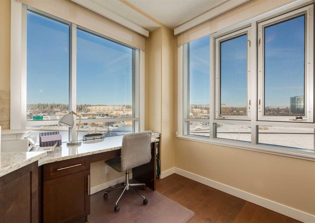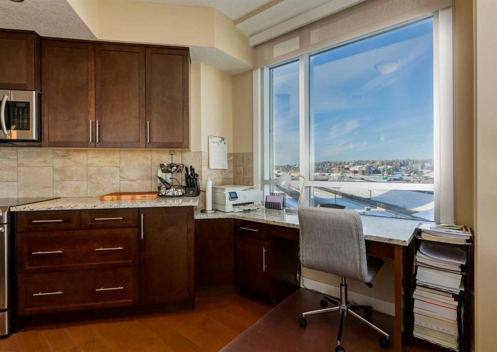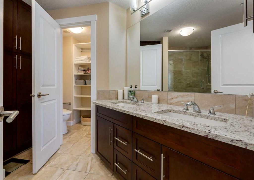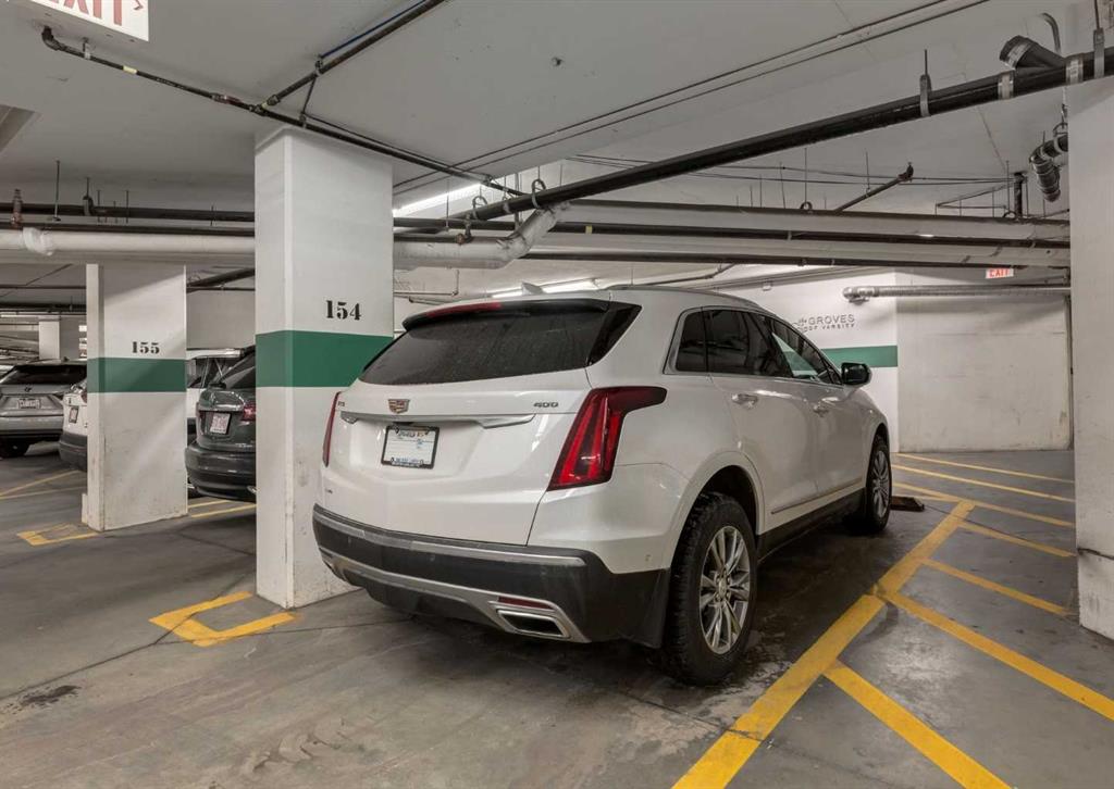 This beautifully upgraded 2 bedroom, 2.5 bathroom condo with 2 titled underground stalls in The Groves of Varsity offers a rare opportunity, just steps from Dalhousie LRT and minutes from Market Mall. Set on the 6th floor of the Monterey III building, it features hardwood floors, granite finishes, custom built-ins, a covered balcony, and floor-to-ceiling windows framing gorgeous views of Nose Hill Park, the city, and downtown. The open, light-filled layout includes a welcoming living area with a built-in media centre, a bright dining space, and a well-appointed kitchen with stainless steel appliances and a dedicated workspace. Both bedrooms offer double closets and full ensuites, with the second bedroom connecting directly to the balcony. Additional highlights include a spacious in-suite laundry/storage room, custom window coverings, an assigned storage locker, and two titled underground parking stalls conveniently located near the elevator. This air conditioned building is concrete and steel construction and residents enjoy exceptional amenities such as a full fitness centre, steam rooms, a lounge and meeting space and a rooftop terrace. The location is ideal—close to the University of Calgary, Foothills and Children’s Hospitals, Market Mall, and just minutes from the Silver Springs Golf Course, with easy access to parks, schools, and downtown. Click on media for the video and book your private showing today to truly appreciate this stunning unit.