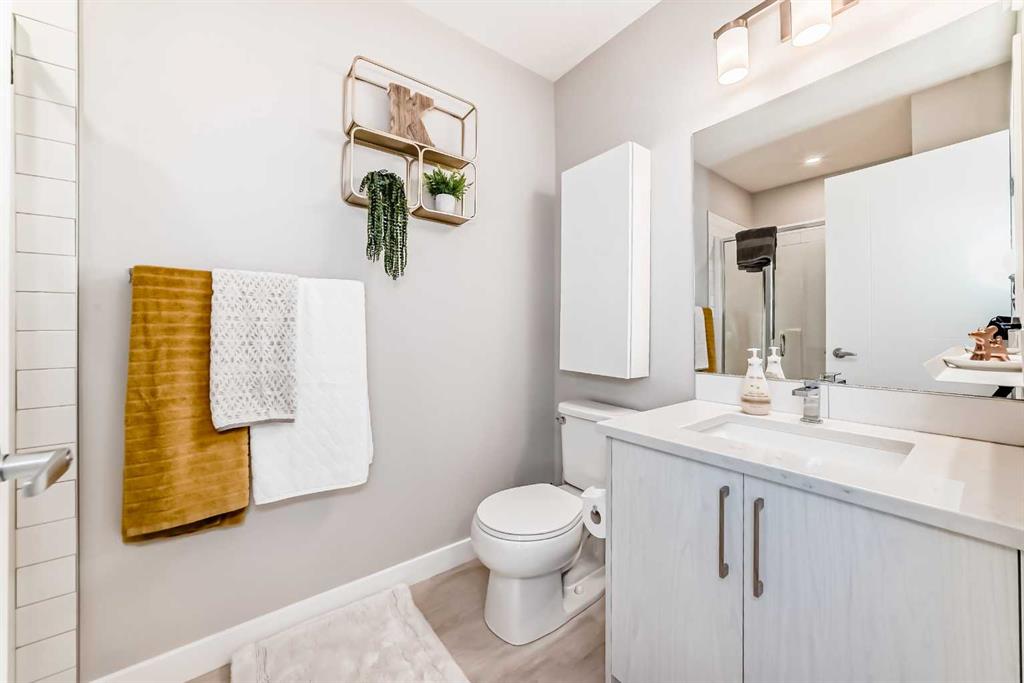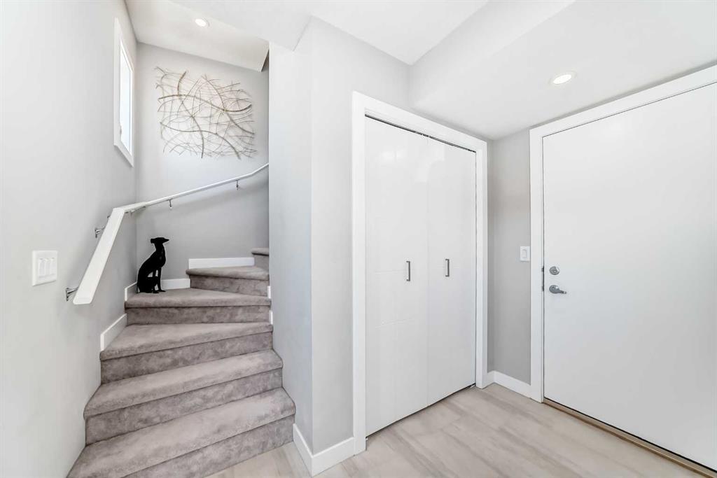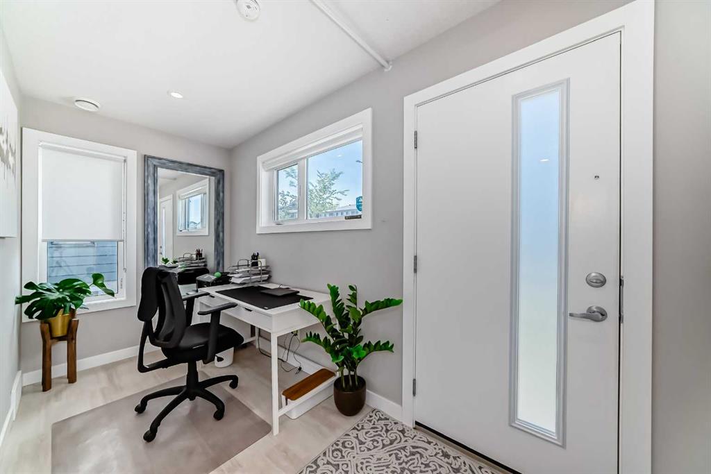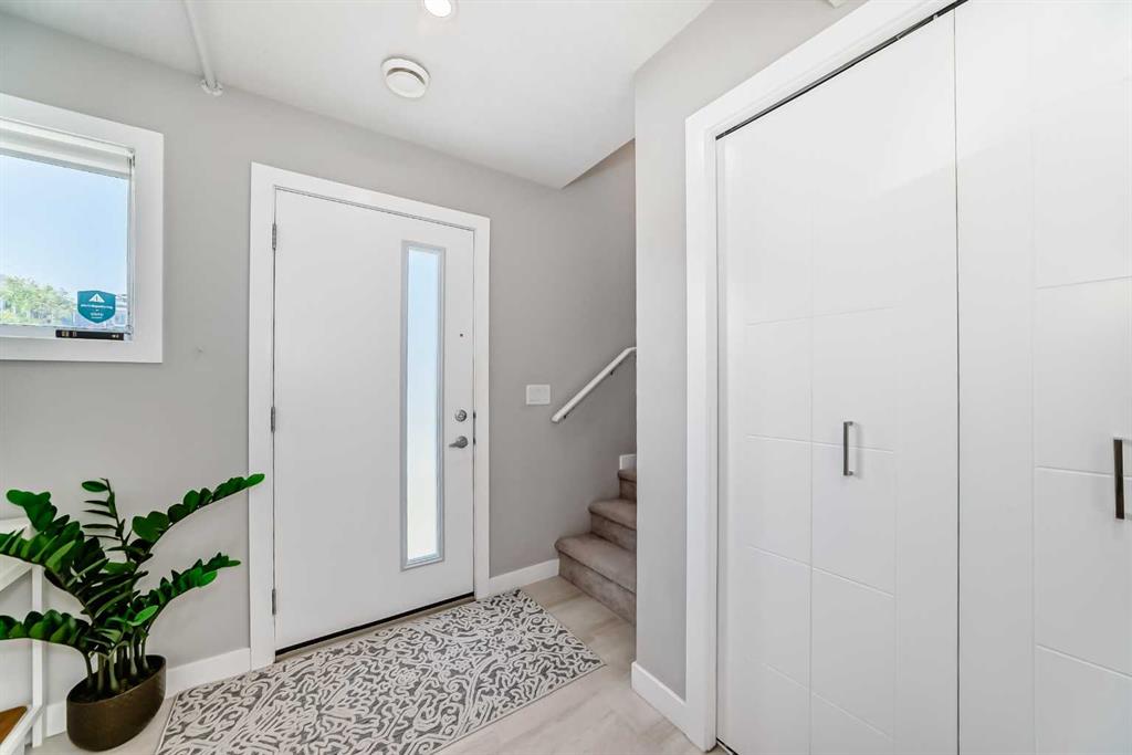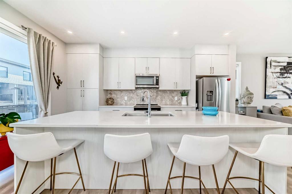 This gorgeous end unit home offers the perfect mix of sophistication, comfort and functionality. As you enter, There is flex space utilized as a office, and entry to the attached double garage. Upper floor, enjoy the open-concept layout with large UV protected windows but let in ample natural light, beautiful designer finishes throughout makes the home feel airy and relaxing. This green certified home features neutral laminate flooring, quartz countertops and stainless steel appliances. Main living area is greeted with a spacious and bright living room that flows seamlessly to kitchen with large island, dining room which leads out into the large balcony to take in the fresh air. The functional half bathroom is nicely tucked away. Upper floor contains cozy master bedroom with ensuite bathroom, 2 other bedroom, a spacious full bathroom and a very convenient laundry room to finish off the upper floor. The designer furniture in home is negotiable to stay with the home. Great location, easy access to main roads, walking distance to shopping centre , parks and schools are nearby.