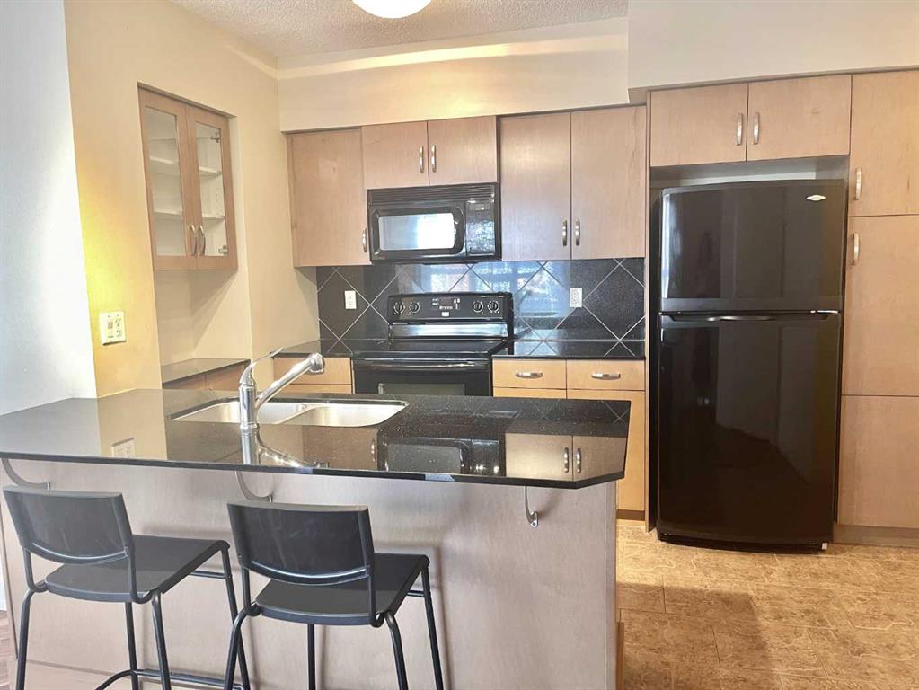 Presenting the largest corner unit in the building—an exceptional 2-bedroom, 2-bathroom residence offering 1040 square feet of thoughtfully designed living space. This upgraded residence features stylish engineered hardwood flooring and an open concept floor plan. A spacious and welcoming foyer with a double closet sets a sophisticated tone upon entry. Expansive windows throughout the unit allow for an abundance of natural light, further enhanced by the addition of elegant, customized double-layer curtains that provide both privacy and light control. The modernized kitchen is outfitted with updated cabinetry and striking black granite countertops, complemented by a suite of matching black appliances. The generous living room offers ample space for comfortable seating arrangements, with an adjacent dining area that opens to a private balcony featuring pleasant views. The primary bedroom includes a well-appointed four-piece ensuite, adding to the home's overall functionality and comfort. Residents will appreciate the building’s direct access to essential amenities, including nearby grocery stores and restaurants, all reachable without the need for elevator use. A convenient door one level below provides quick, weather-free access to Save-On-Foods via the 4th-floor parkade. Additional features include on-site security, a dedicated concierge, and ample indoor and guest parking. Situated in a highly desirable location within walking distance of numerous services and conveniences, this professionally upgraded unit with a sought-after layout represents exceptional value in today’s market.