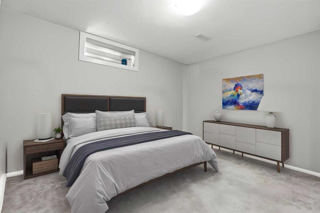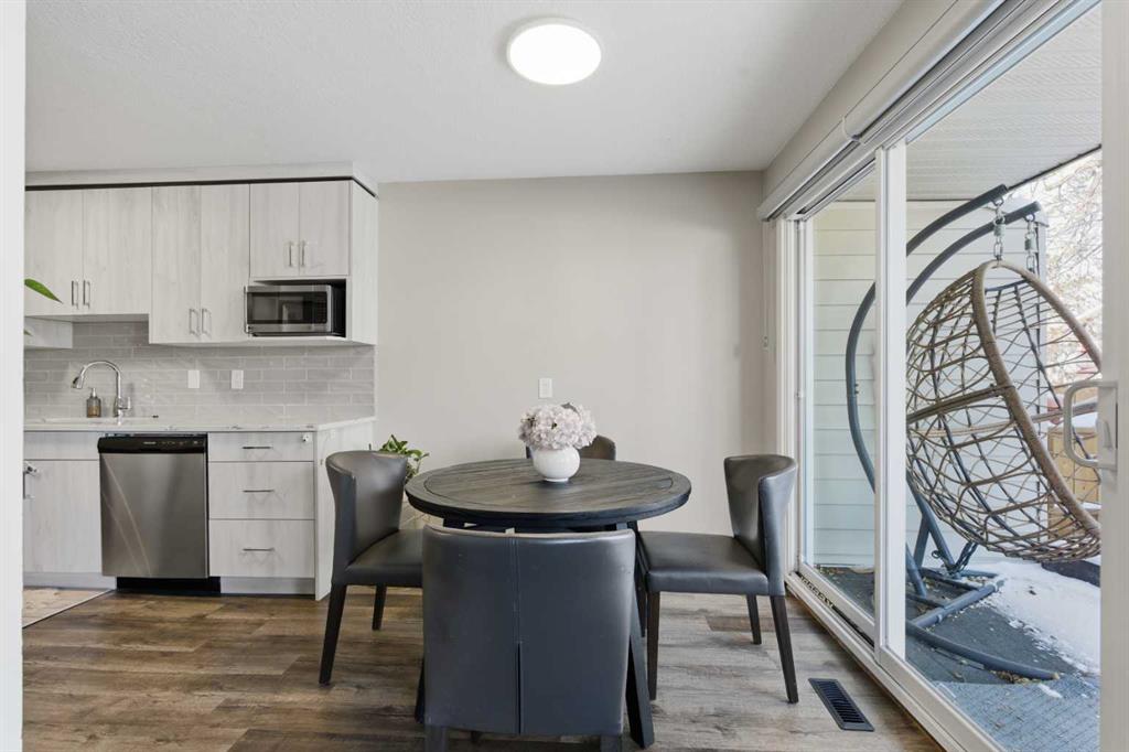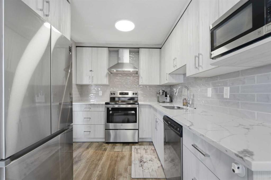 RARE Move-In-Ready Affordable BUNGALOW style CORNER LOT backing onto GREENSPACE: Imagine Waking up to park views, mature trees and a private fenced yard by purchasing an affordable fully renovated, warm and welcoming home where peaceful evenings become a new routine. RENOVATED END UNIT | BACKS ONTO MARLBOROUGH PARK | FINISHED BASEMENT | 3 BEDROOMS | 2 BATHROOMS | DESIGNER LIGHTING | GRANITE COUNTERTOPS | MODERN KITCHEN & BATHROOMS | PRIVATE YARD | Stylishly renovated and ideally located, this end-unit bungalow offers a perfect blend of comfort, design and everyday functionality. Backing directly onto Marlborough Park and Walking distance to Roland Michener School + St. Martha School the home enjoys peaceful green views and a sense of privacy rarely found in this price range. A thoughtful layout showcases designer lighting, updated flooring and elegant finishes that create a welcoming and contemporary atmosphere throughout. The kitchen inspires culinary creativity with stainless steel appliances, full-height cabinetry, granite countertops and timeless subway tile backsplash, seamlessly connecting to the open dining area where oversized sliding doors lead to the rear deck. This easy indoor-outdoor flow extends the living space for everyday enjoyment and summer gatherings. The bright living room is a comfortable retreat with sightlines to the backyard and mature trees beyond. Two spacious bedrooms and a refreshed 4-piece bathroom complete the main level. Downstairs, the finished basement continues the same stylish design, offering a generous recreation area ideal for movie nights, hobbies or a home office setup. A third bedroom and an additional updated bathroom make this level versatile for guests or extended family, while the laundry and storage areas add practical convenience. Outside, the private deck invites morning coffee or evening barbecues surrounded by greenery, with direct access to the park’s walking paths, playgrounds and community sports courts.Two assigned parking stalls are located near the front door, along with a lot of visitor parking + additional on-street parking for visitors. Pet-friendly with board approval, this well-managed complex offers an exceptional lifestyle in a vibrant community known for its active recreation centre, excellent schools, nearby shopping, dining and easy transit connections. This move-in-ready home delivers the rare combination of style, space and a serene park-backing setting!