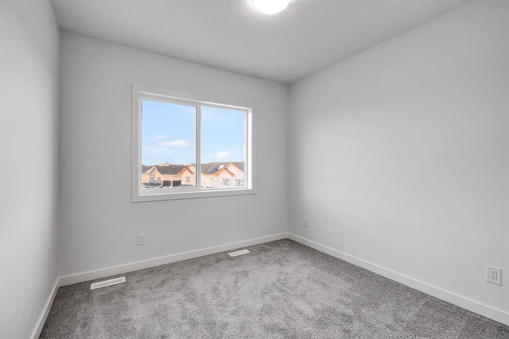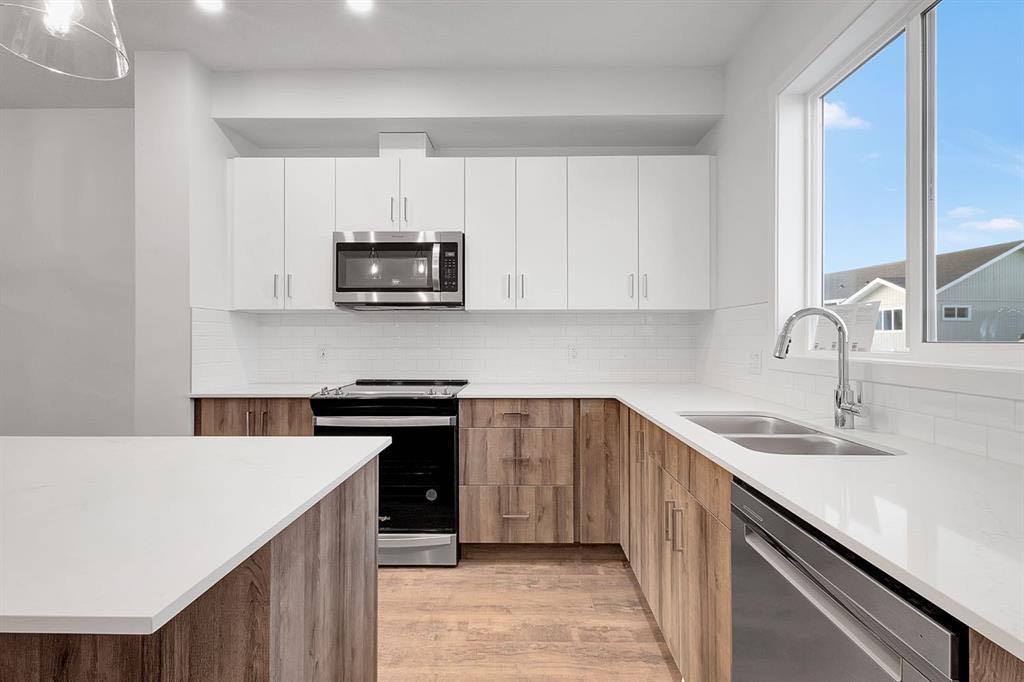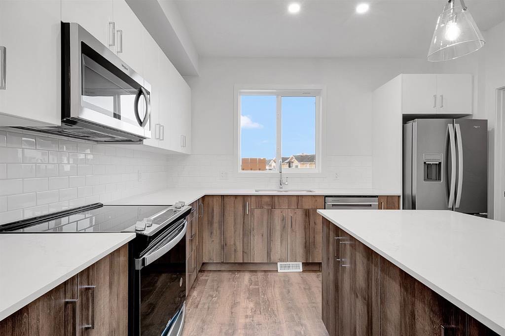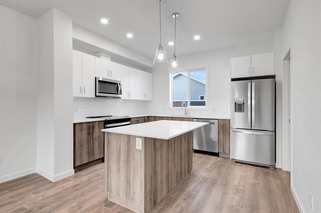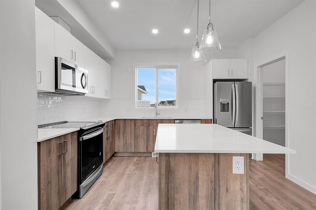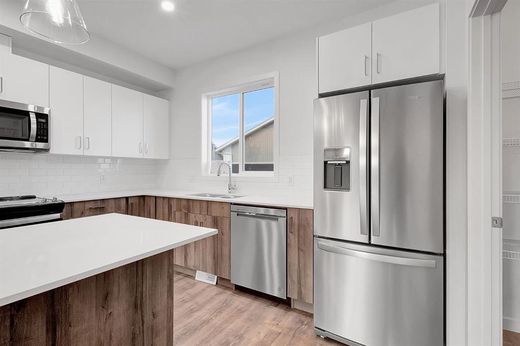 Modern and Stylish Townhome in Red Embers Point by Award-Winning StreetSide Developments Welcome to #627 in Red Embers Point East, a beautifully designed 3-bedroom, 2.5-bathroom townhome built by the award-winning StreetSide Developments in the desirable Redstone community. This modern MOVE IN READY home boasts a bright and open floor plan with premium finishes, offering a perfect combination of style and functionality. The main floor features an elegant kitchen with sleek cabinetry, stainless steel appliances, a large central island, and a spacious pantry, making it ideal for both everyday living and entertaining. The dining area flows seamlessly into the cozy living space, with large windows allowing for plenty of natural light. Just off the main floor, a private deck provides the perfect spot for outdoor relaxation. Upstairs, you'll find a well-appointed primary bedroom with a walk-in closet and a luxurious ensuite bathroom featuring dual vanities and a walk-in shower. Two additional bedrooms offer ample space for family or guests, with a full bathroom and a convenient laundry area located just down the hall. The lower level offers a flexible space that can be used as a home office, gym, or additional storage. Completing this home is the tandem double attached garage, ensuring plenty of parking and storage options. Located in the vibrant community of Redstone, this home is close to parks, playgrounds, and pathways, with easy access to shopping, schools, and major roadways. Don’t miss the opportunity to live in this beautiful new townhome! PHOTOS ARE FROM A COMPLETED UNIT IN ANOTHER PROJECT - RED EMBERS POINT.