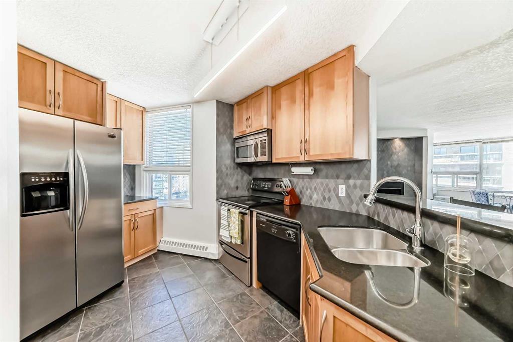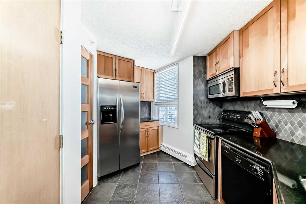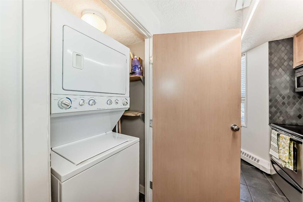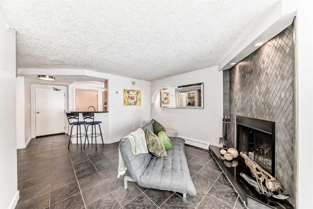 This upgraded top-floor, open-concept residence has so much to offer. A spacious entryway welcomes you into a modern kitchen featuring updated appliances, granite countertops, new light fixtures, a pantry, and beautiful maple cabinetry—with an impressive amount of storage for an apartment. The living room is warm and inviting, centred around a cozy fireplace with a stunning tiled mantle. Beyond the living area, you’ll find a bright dining space and a versatile den or office, both filled with natural light. The large primary bedroom includes a walk-in closet, while the modern four-piece bathroom has been tastefully updated. An added bonus: there’s no carpet throughout the unit. This home comes with two parking spots—one assigned underground heated stall and an additional outdoor rental space. In-suite laundry adds everyday convenience. Enjoy easy access to the 360-degree wraparound rooftop patio, located just steps from your door. The unbeatable location places you only one block from the vibrant energy of 17th Ave, with shops, cafés, restaurants, parks, groceries, transit, and cultural attractions all within walking distance. Blending comfort, space, and urban convenience, this property truly stands out as a gem.