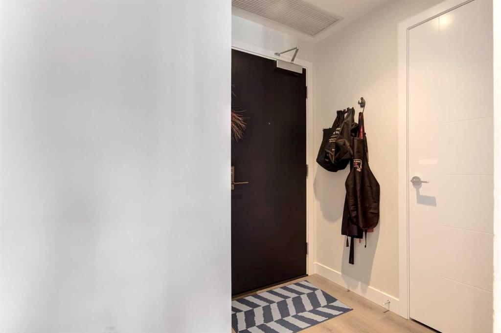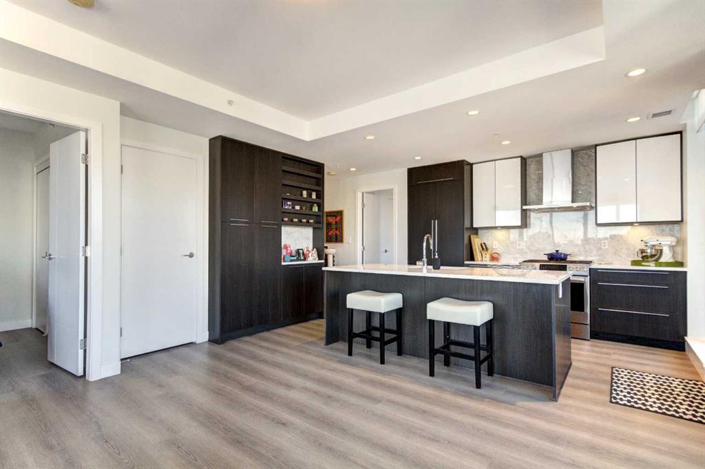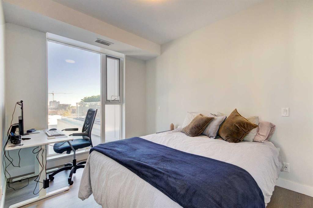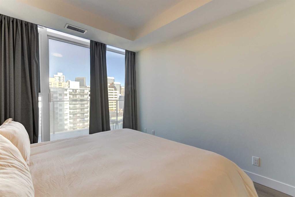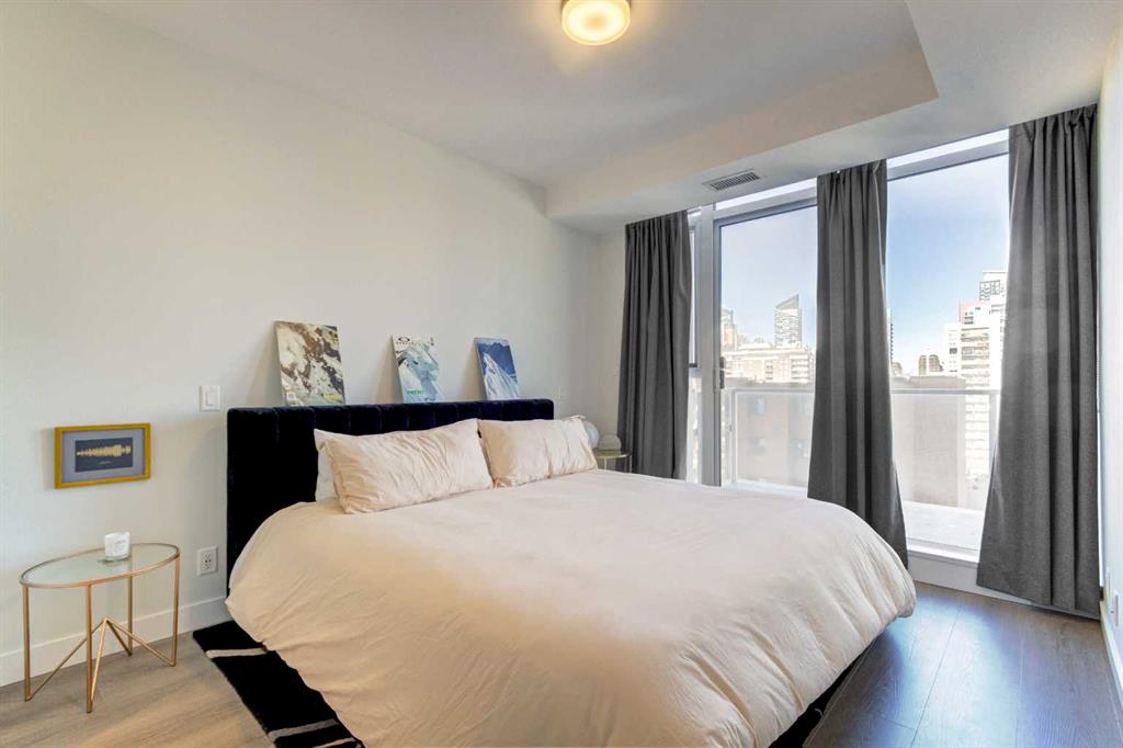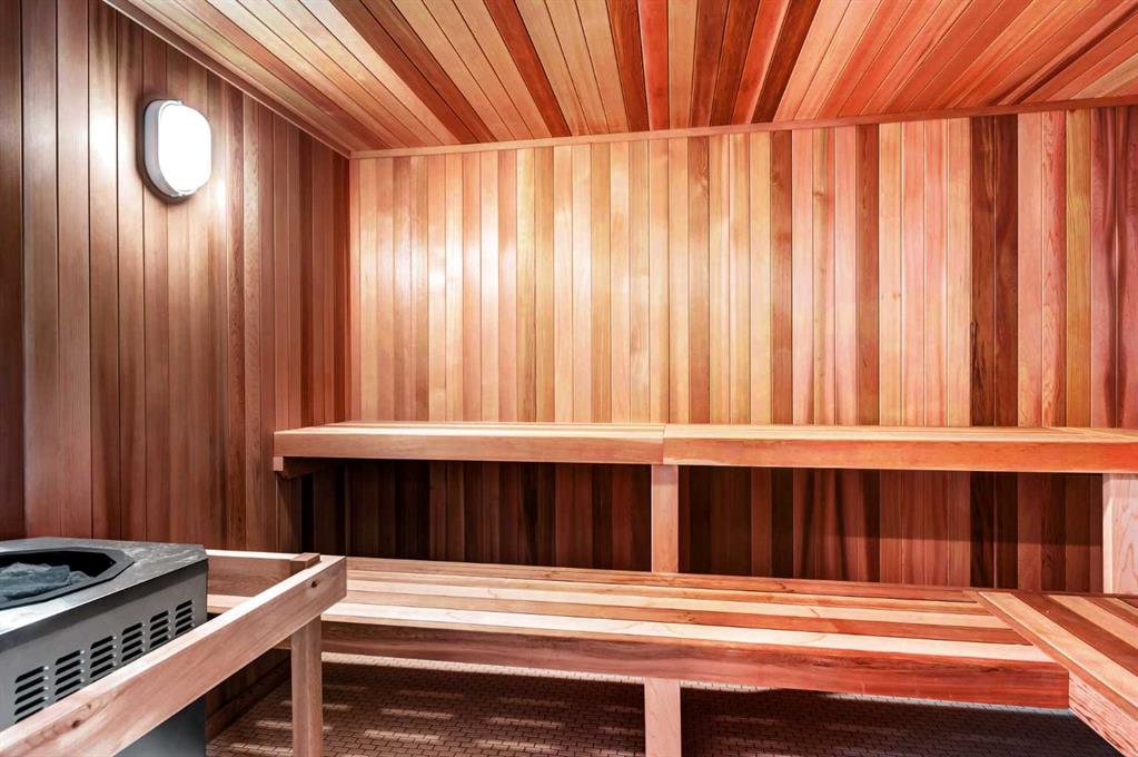 Welcome to unit 703 in The Royal! A lovely 2 bedroom 2 bathroom double balcony corner unit with stunning downtown views. The floor to ceiling windows flood the main living space with natural light and the north and east vistas are stunning. The bright kitchen is fully equipped with a large quartz island, high end appliances, plenty of cabinet and counter space with custom built in - all overlooking the main living and dining areas, perfect for entertaining. Large primary bedroom, with direct access to the second balcony, features a walk-in closet, an ensuite with a large glass door shower, double vanity and heated floors. The second bedroom is located on the opposite side of the unit, perfect for guests or home office. Other features include air conditioning, a gas line on the balcony for bbq, in-suite full size stacked laundry and additional 4 piece bathroom with soaker tub. Residents can enjoy the many amenities including a fitness center, steam room, sauna, squash court, 24-hour concierge/security, outdoor courtyard, and private dining area for larger get togethers. Located just off 17th avenue you will have quick access to great shopping, restaurants, groceries, coffee shops and pubs. Building is very pet friendly, with approval, and there are many parks and green spaces near by. This unit is complete with a secure heated underground parking space and a separate storage locker. An excellent well cared for urban home.