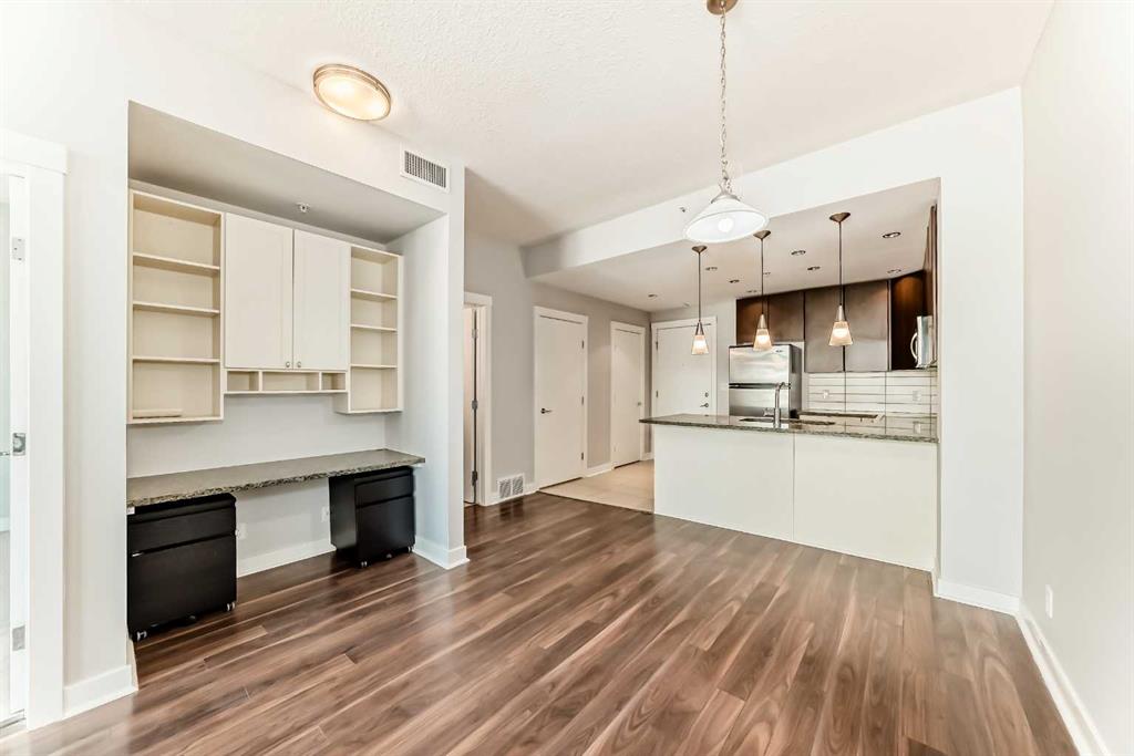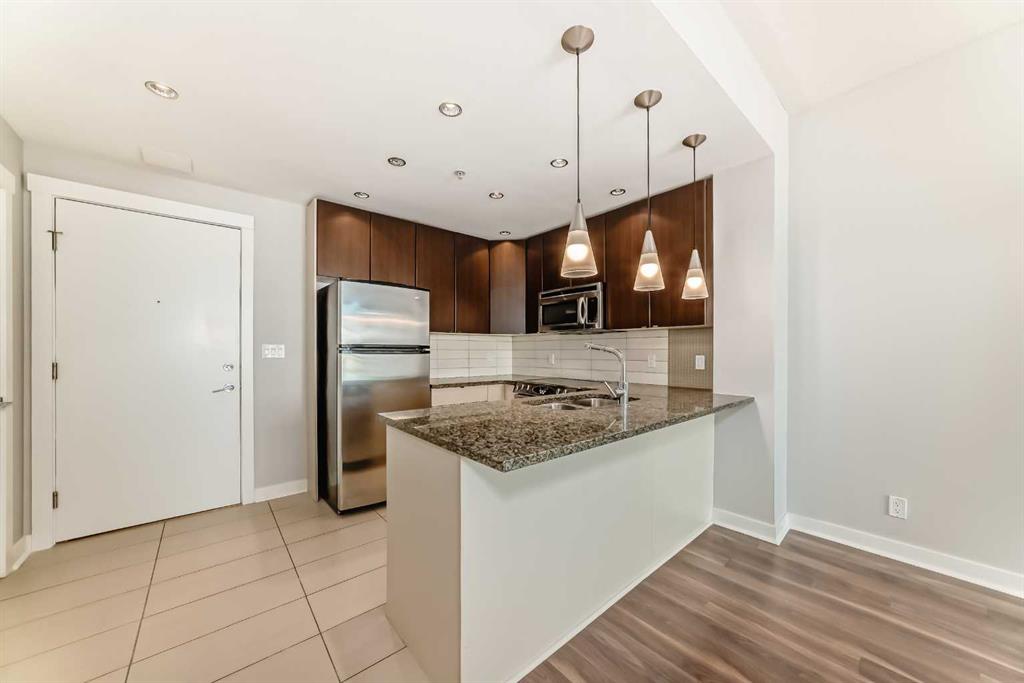 Welcome to vibrant downtown living in the heart of the Beltline in this upscale building and close to EVERYTHING! Feel right at home in this awesome open floor plan 1 bedroom unit with amazing WEST views! This home is perfect for the first time buyer, investor or someone who works downtown (Just walk to work!) As you enter you have a storage room , Laundry area with lots of shelving for storage and opposite from that is the kitchen that features granite counter tops, tiled backsplash, ample amount of 2 toned cabinets and a good amount of counter space, stainless steel appliances and an over the counter microwave/hood fan! Beside the kitchen you will love the workspace for your computer with plenty of cabinet storage! There is a large living room with laminate flooring and access to the balcony to enjoy the views from! The bedroom also allows you to enjoy the views with floor to ceiling windows and the sunsets are stunning every evening! There is a full bath with a tiled shower and flooring. This building ALSO features a separate storage locker and underground heated parking, beautiful tiled hallways and is just a few blocks from 17th Ave shops, restaurants, pubs, river pathways and SO MUCH MORE! This is definitely a must see and one to put on your list!