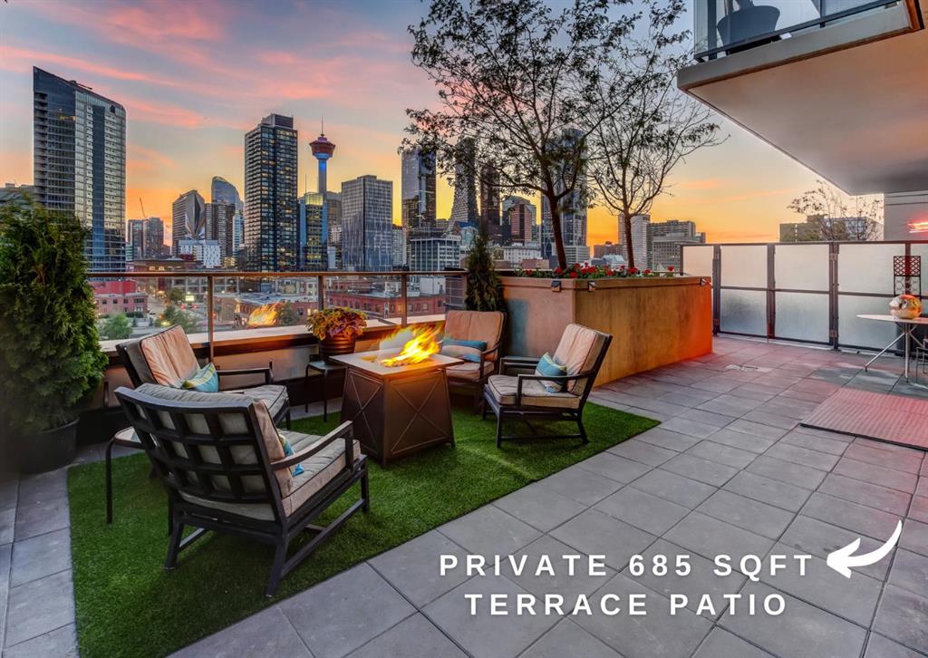 Love downtown living but craving outdoor space? This stunning SW corner terrace unit offers the best of both worlds - a rare, wrap-around 685 sqft terrace with breathtaking views of the city skyline. Located on the 7th floor, this bright and spacious corner layout features 10’ ceilings and expansive floor-to-ceiling windows that flood this unit with natural light and truly bring the outdoors in. The sleek modern kitchen is thoughtfully designed with built-in appliances, quartz countertops, and a convenient microwave shelf to keep your counters clear and functional. The primary bedroom includes upgraded custom closet built-ins to maximize storage, along with a 4-piece ensuite for added comfort. A true bonus: titled indoor tandem parking, rarely found in the building, ideally situated on the 4th level above ground right next to the elevator doors (and only 3 floors down the stairs), with natural light streaming into the parkade through shaded windows. Perfect for the urban professional, you’re just steps from the Saddledome, downtown, C-Train, river pathways, shops, restaurants, and all amenities. Residents of The Guardian enjoy premium amenities including concierge service, a fully equipped fitness centre (directly below unit), social lounge, workshop, visitor parking, and a beautifully landscaped garden terrace with BBQs. With stairs conveniently nearby, you’ll never have to wait long for an elevator. Don’t miss this rare opportunity to enjoy downtown living with exceptional outdoor space!