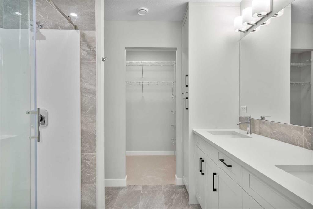 Both bathrooms are elegantly appointed with tile flooring and quartz countertops. The ensuite feels like a private retreat, offering dual undermount sinks, a 10mm Sydney Barn-style sliding glass shower door with a chrome top rail and 8-inch D-handle, and a bright shower pot light. A built-in linen tower adds practical storage, and additional GFI power outlets enhance functionality. The second bathroom mirrors the same high-end finishes, ensuring a cohesive design throughout.