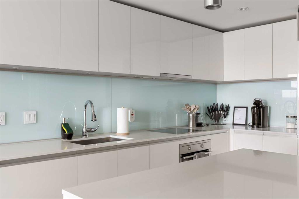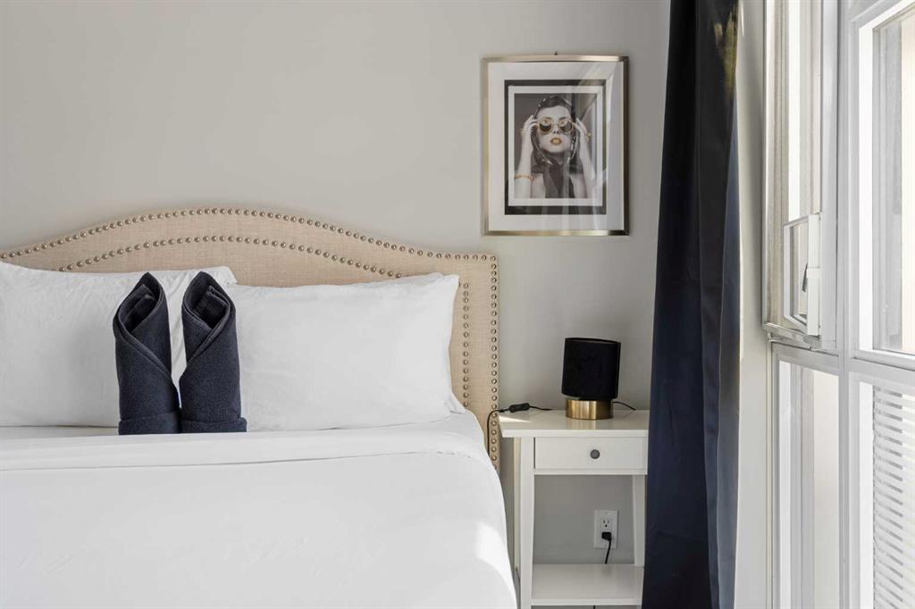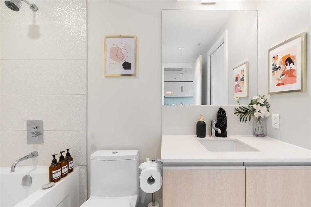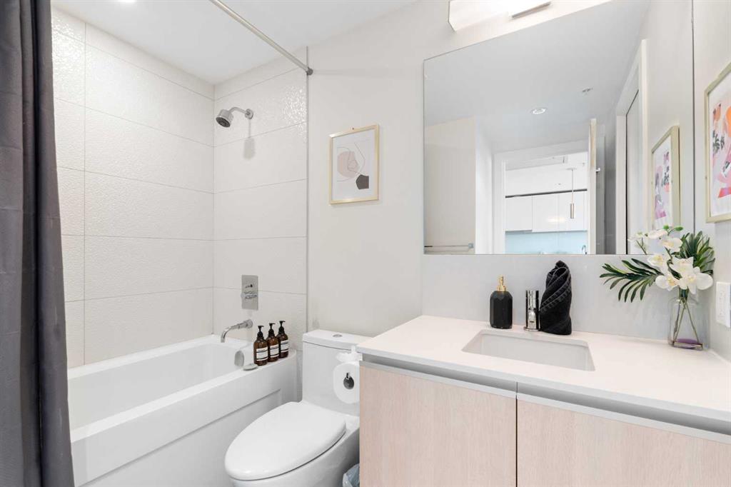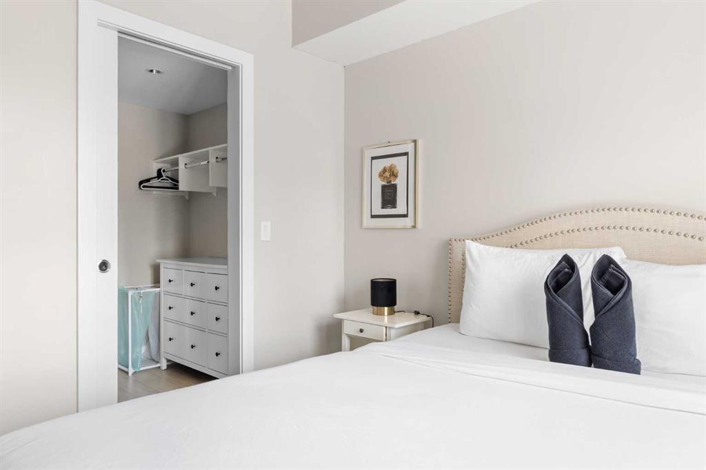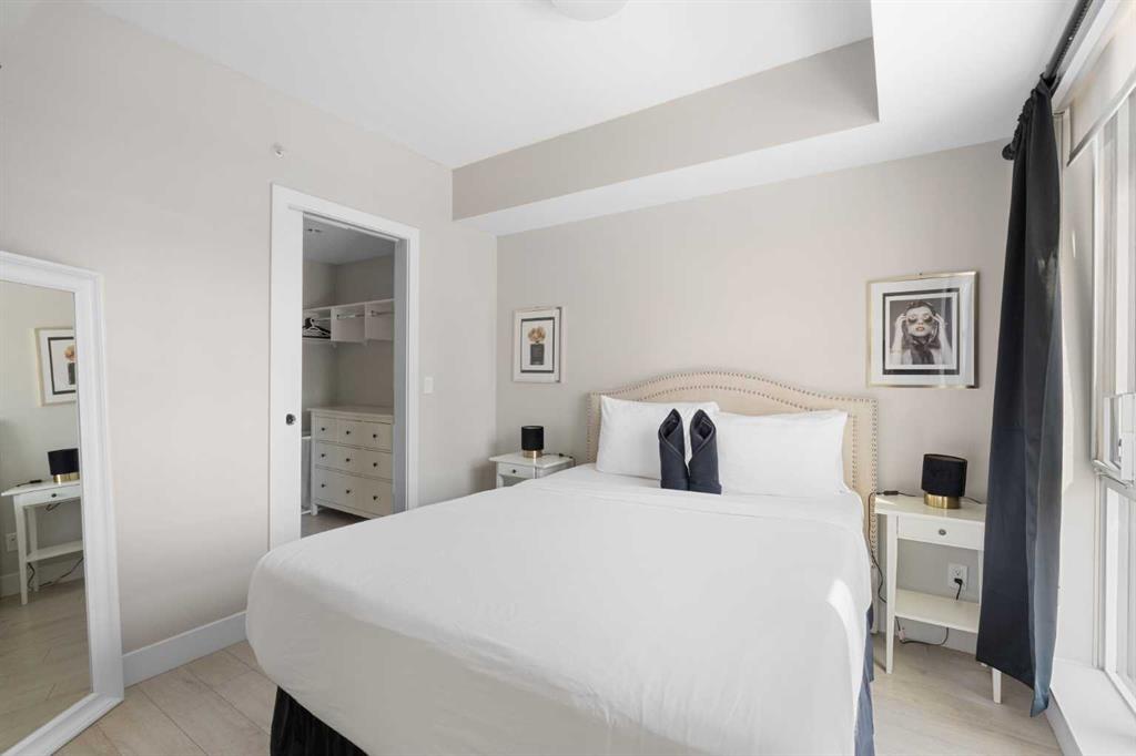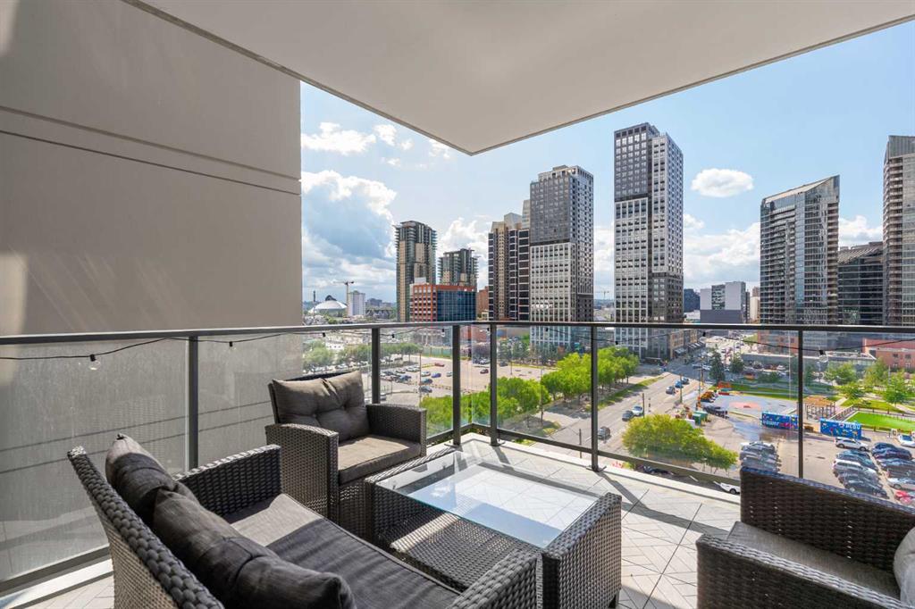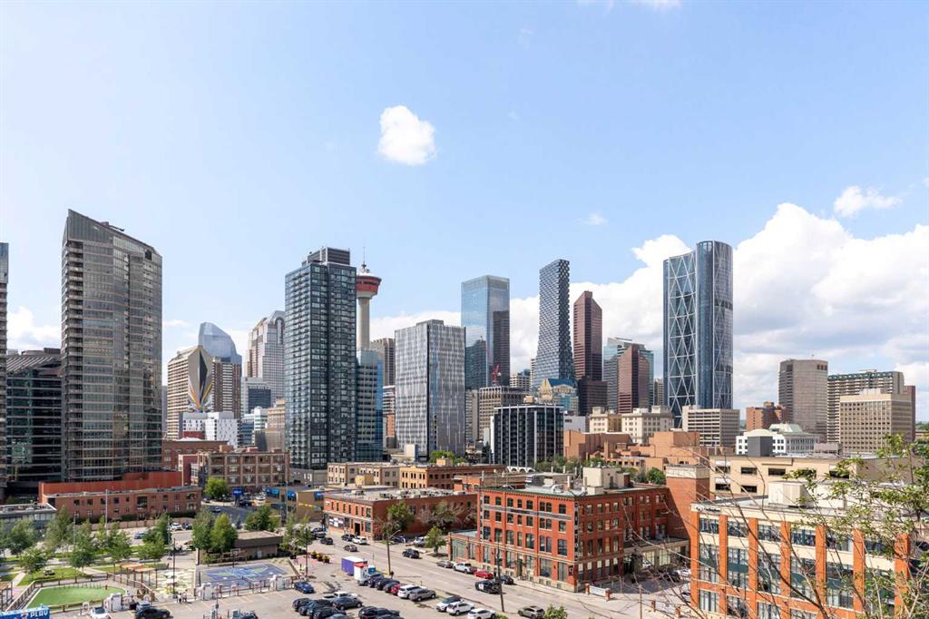 Enjoy upscale downtown living in this stylish 1-bedroom condo perched on the 8th floor of The Guardian, one of Calgary’s most recognizable residential towers. Showcasing west-facing skyline views through expansive floor-to-ceiling windows, this home blends contemporary design with functional comfort. The open-concept layout features a modern kitchen with a centre island, quartz countertops and sleek cabinetry, perfect for everything from quick meals to evening entertaining. The bright living room opens to a generous balcony, creating a seamless flow between indoor and outdoor space. The bedroom offers full-height windows, a walk-through closet and convenient access to the well-appointed 4-piece bathroom. Stay cool with central air conditioning, enjoy the ease of in-suite laundry, and benefit from titled underground parking. This secure, amenity-rich building includes 24-hour concierge service, a state-of-the-art fitness centre, yoga room, workshop, lounge with TVs and kitchen and a landscaped rooftop terrace with BBQs, fire tables, and panoramic views. Located in the heart of Calgary’s urban core, The Guardian puts you steps from the C-Train, Stampede Grounds, East Village, Repsol Centre, river pathways, and the restaurants, boutiques, and nightlife of 17th Avenue. Whether you're a professional, investor, or first-time buyer, this is your chance to own a sophisticated retreat in one of the city's most vibrant communities.