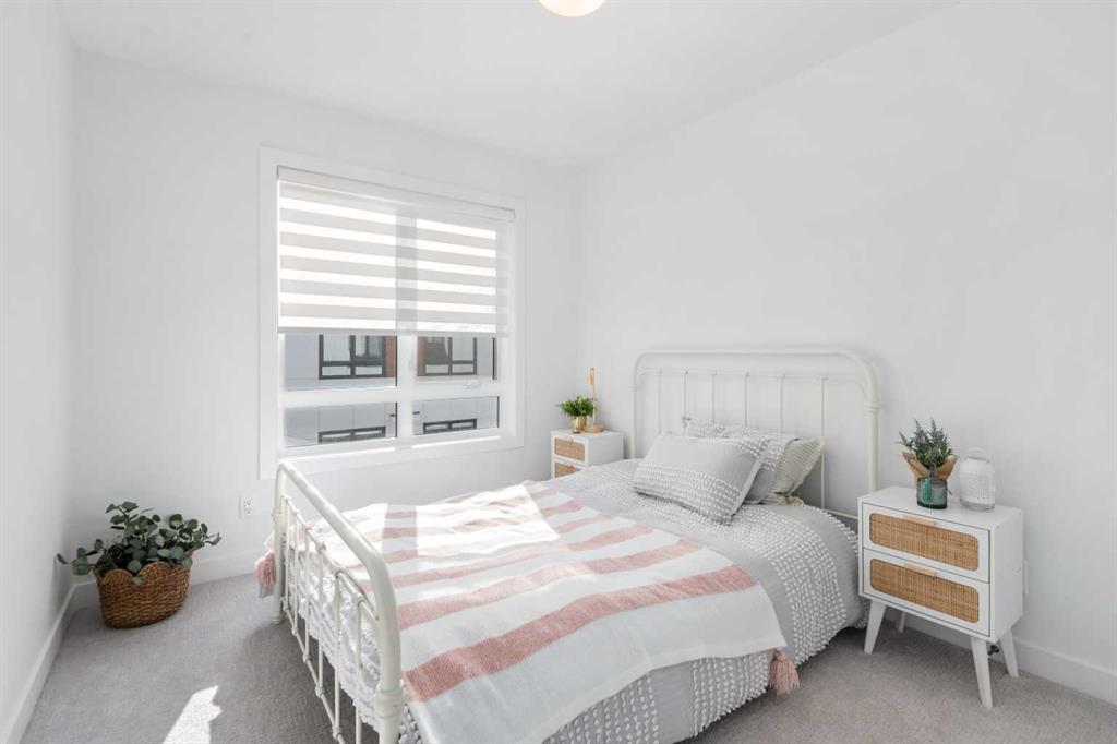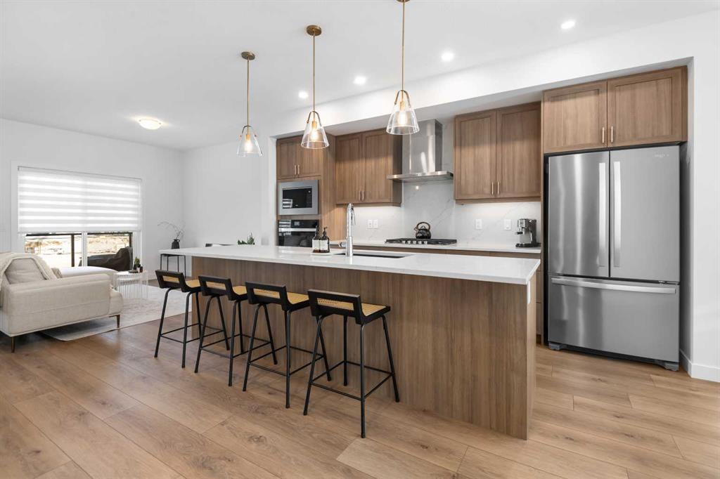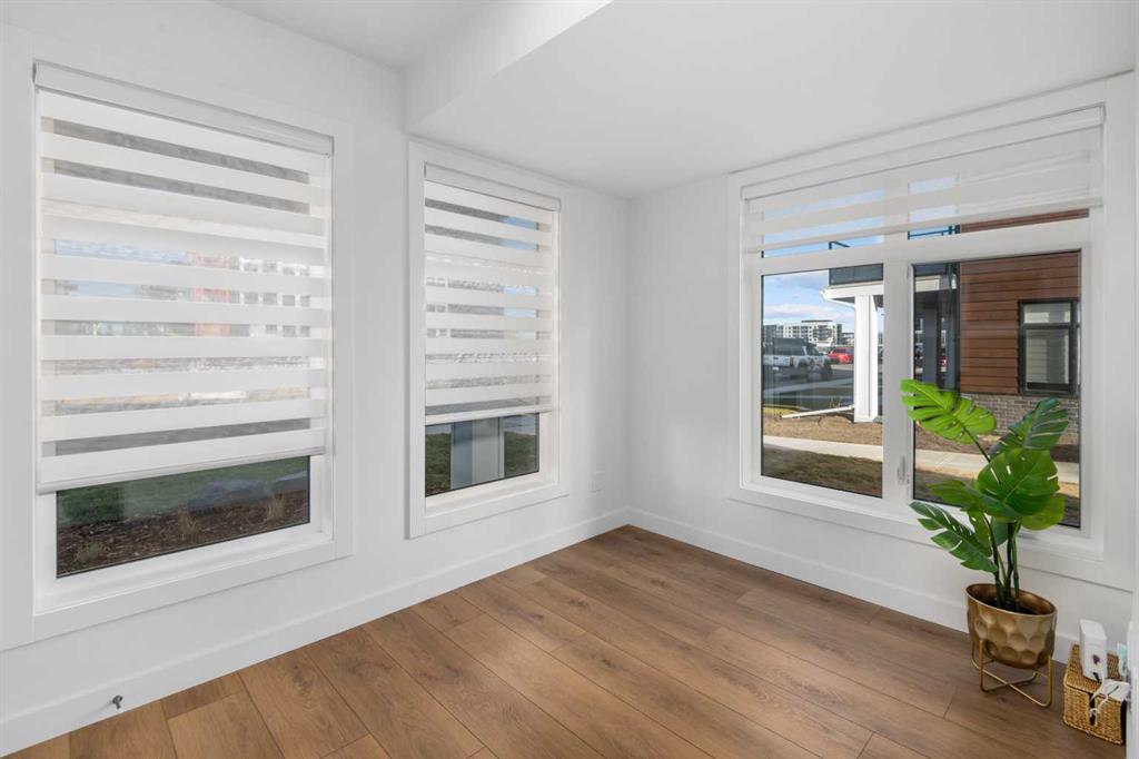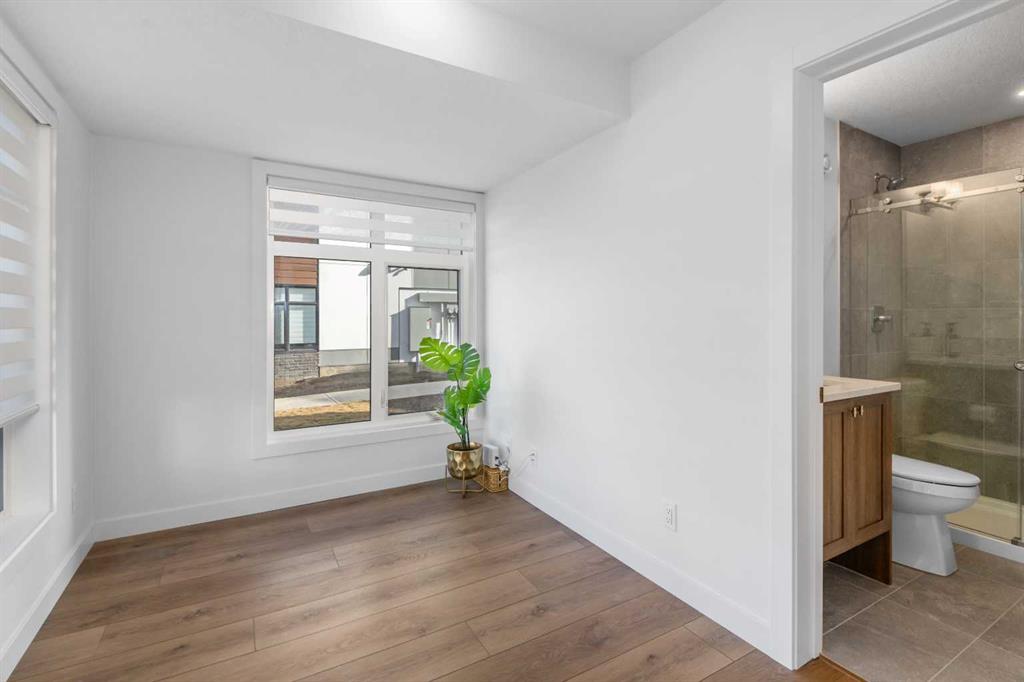 Trico homes brings to West Springs one of the best designed townhomes in this amazing master planned community. Close to everything you would ever want, and in true walking distance. This bright and abundantly spacious corner unit features 4 bedrooms, 3.5 baths, with a unique main level bedroom with full ensuite. As you enter your custom home from your double attached garage, you are greeted into a large foyer. The bedroom/den on this level is very convenient, and a flexible option. The second level boasts 9 foot ceilings, is bright, spacious, fully open, and features a fantastic centre kitchen plan. The formal living and dining rooms are on either side, making this the perfect entertaining space, or just enjoying day to day luxury living. The kitchen was with modern quartz counters and matching upgraded full backsplash. High end appliances for your cooking enjoyment, include a counter gas stove and wall ovens. The kitchen Island is the perfect gathering place for friends and family, as the chef prepares culinary delights, surrounded by premium cabinetry and fixtures. Off the living area there is a huge balcony which can be used as a relaxing extension of the main living area, or additional dining and bbq space, for year round relaxation. The upper floor features 3 additional bedrooms. Two bedrooms facing south with large windows, and a main full bath. The master is truly spacious , bright, and of course has a fantastic ensuite with dual sinks, tub, shower, and walk in closet. This level conveniently has a laundry room, with sink and custom cabinetry. Upgrades total over 30k for this unit which makes it the best value on the market, with 4 Bedrooms and 3.5 baths, and truly like new! The location is unbeatable, close to all parks including the off leash radio park, shopping, restaurants, schools and all of West Springs amazing amenities. Motivated seller due to relocation.