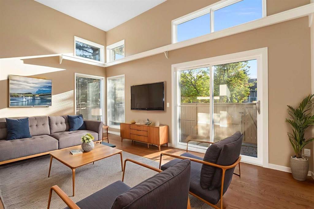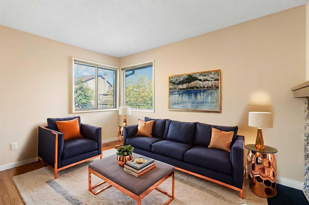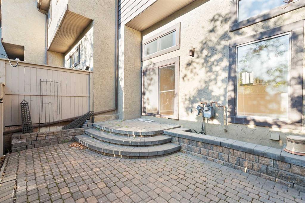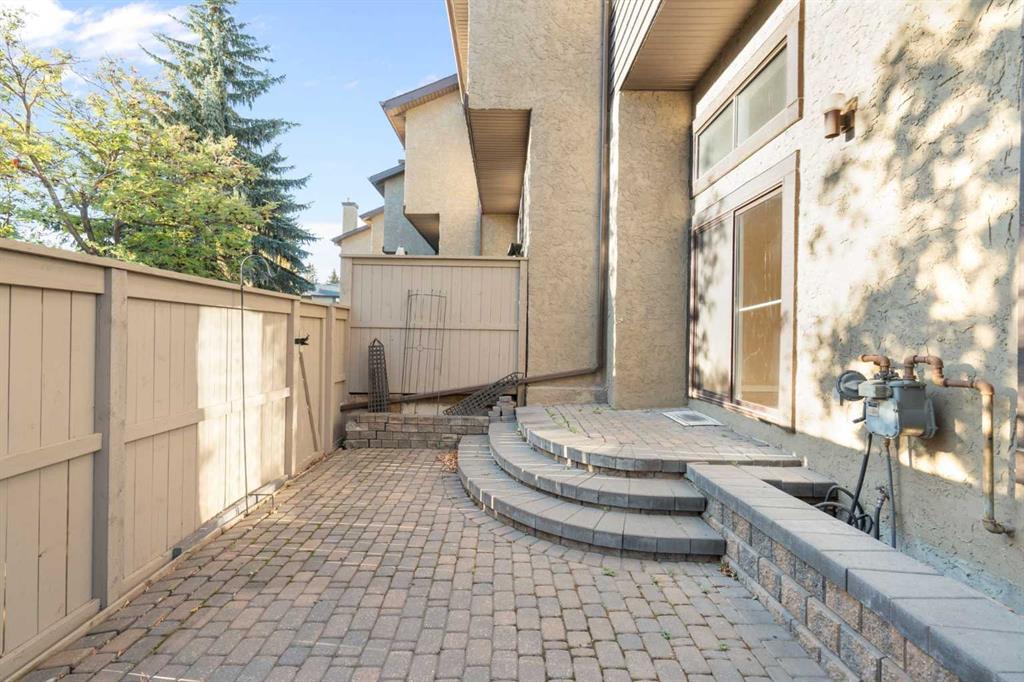 EASY LIVING in Glamis Gardens! Terrific end unit Townhome has wonderful natural light throughout the spaces. Separate entry level with closet and access to the attached two-car garage provides a nice introduction to the unit. Step up to the bright living room with vaulted ceiling and sliding doors out to the large private, professionally designed cobblestone patio and garden (please also see Supplements). On the next level are the kitchen, dining and family rooms. Kitchen features beautiful custom cabinetry, checker plate backsplash, plenty of counter and cupboard space, tempered glass raised eating bar, upgraded lighting and full pantry. Separate dining area to comfortably host your guests. Relax in the family room with warm fieldstone wood burning fireplace. Gleaming solid Quebec hardwood (see Supplements) throughout the living, dining, kitchen and family rooms. Two-piece bathroom with custom sink completes this level. Spacious master bedroom with previously upgraded (see Supplements) three-piece ensuite and dual closets. Two other good-sized bedrooms (currently configured as a large single bedroom, great for combined sleeping and work space) and upgraded main bathroom complete the upper level. Partial basement utility space provides open laundry area, storage and large crawl space. Recent updates include; Freshly Painted (Oct. 2025), Stove (2024), Microwave/Hood Fan (2024), Garage Door (2023) and High Efficiency Furnace (2022). Unit, carpets, furnace and ducts professionally cleaned just prior to listing. Minutes from Westhills shopping, restaurants, and services, plus Canadian Tire, London Drugs, Co-Op, and many more. Close to schools, Mount Royal University, and transit. Easy access to Sarcee, Glenmore and Stoney Trails so very quick to get around town or go out of town. READY to move in, RELAX and ENJOY!