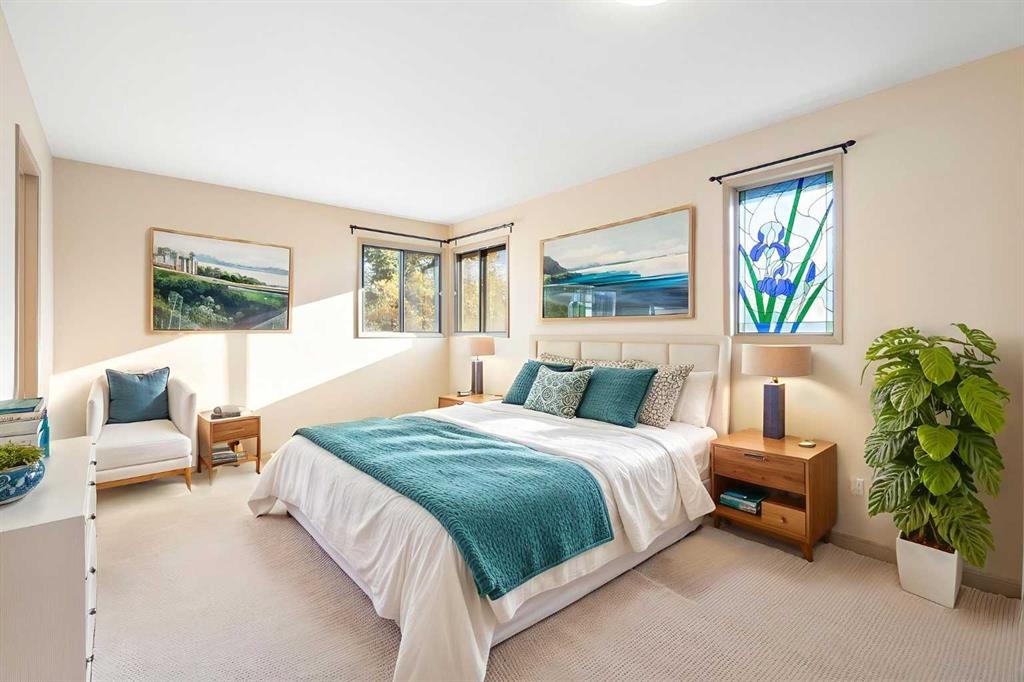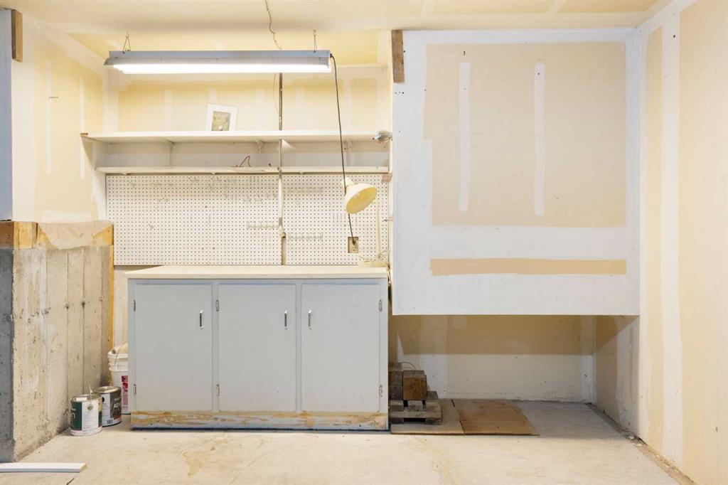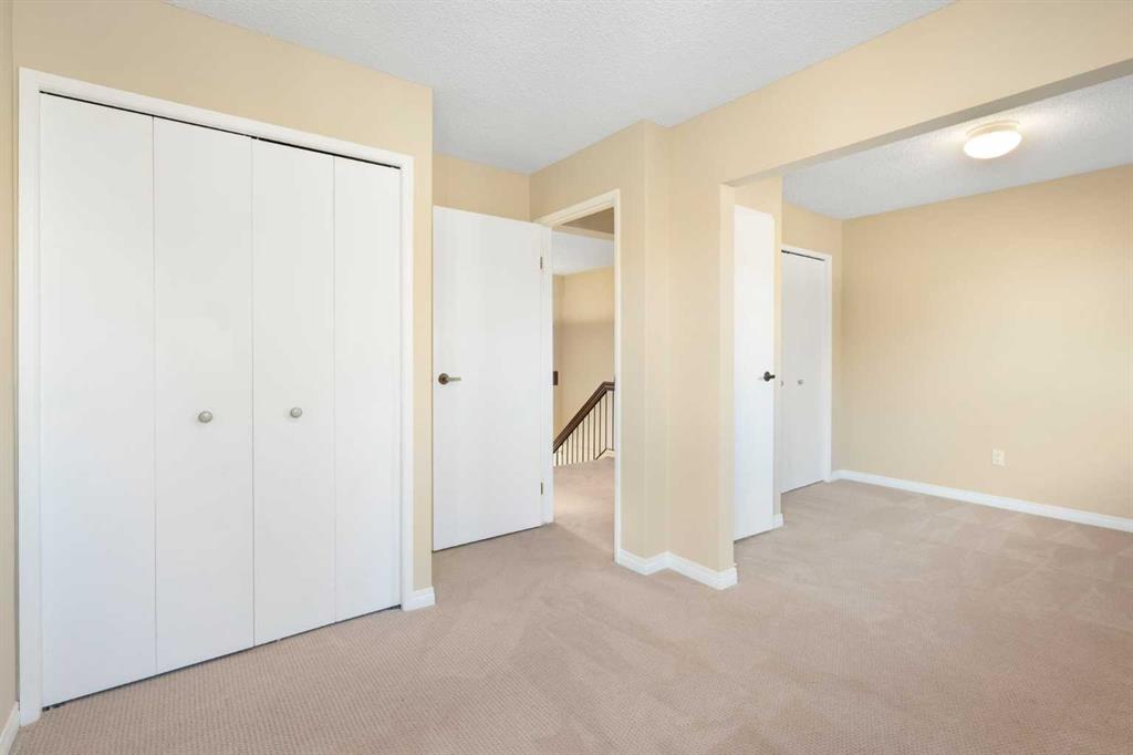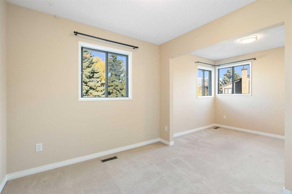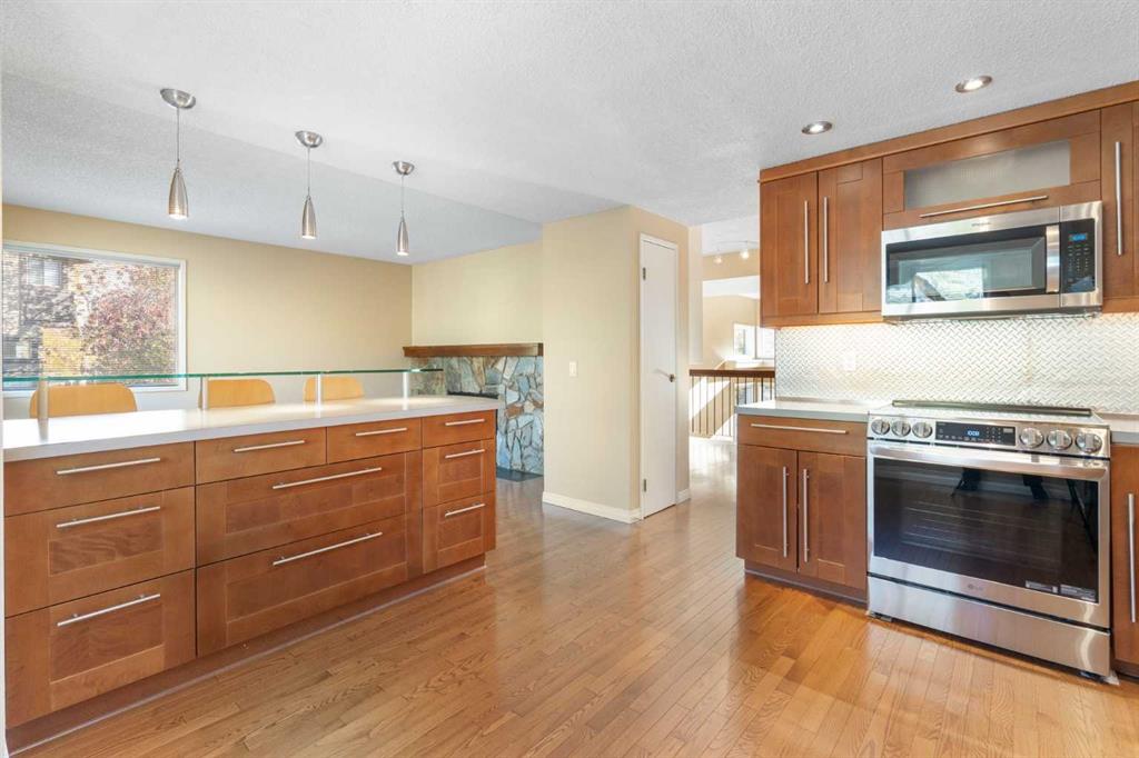 EASY LIVING in Glamis Gardens! Terrific end unit Townhome has wonderful natural light throughout the spaces. Separate entry level with closet and access to the attached two-car garage provides a nice introduction to the unit. Step up to the bright living room with vaulted ceiling and sliding doors out to the large private, professionally designed cobblestone patio and garden (please also see Supplements). On the next level are the kitchen, dining and family rooms. Kitchen features beautiful custom cabinetry, checker plate backsplash, plenty of counter and cupboard space, tempered glass raised eating bar, upgraded lighting and full pantry. Separate dining area to comfortably host your guests. Relax in the family room with warm fieldstone wood burning fireplace. Gleaming solid Quebec hardwood (see Supplements) throughout the living, dining, kitchen and family rooms. Two-piece bathroom with custom sink completes this level. Spacious master bedroom with previously upgraded (see Supplements) three-piece ensuite and dual closets. Two other good-sized bedrooms (currently configured as a large single bedroom, great for combined sleeping and work space) and upgraded main bathroom complete the upper level. Partial basement utility space provides open laundry area, storage and large crawl space. Recent updates include; Freshly Painted (Oct. 2025), Stove (2024), Microwave/Hood Fan (2024), Garage Door (2023) and High Efficiency Furnace (2022). Unit, carpets, furnace and ducts professionally cleaned just prior to listing. Minutes from Westhills shopping, restaurants, and services, plus Canadian Tire, London Drugs, Co-Op, and many more. Close to schools, Mount Royal University, and transit. Easy access to Sarcee, Glenmore and Stoney Trails so very quick to get around town or go out of town. READY to move in, RELAX and ENJOY!