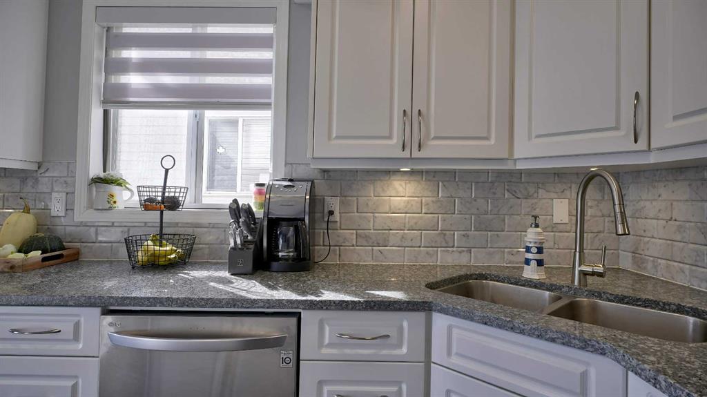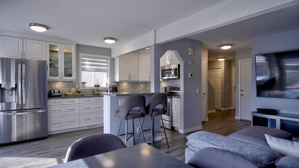 Truly a chef’s delight! Featuring sleek quartz countertops, gleaming white cabinetry, and an eat-up breakfast bar perfect for family gatherings. Open concept is seamless to the living room, with plenty of room for relaxing. As an end unit, you’ll enjoy extra windows that flood the home with natural light. Entry way hosts the convenient half bath plus linen closet, and a jacket closet. Built in desk for your home office, at the top of the stairs. 2 spare bedrooms upstairs, one with extra high ceiling and would make a great bonus room! Primary bedroom is great size, with a double closet. The updated full bathroom boasts double sinks, dual mirrors, and modern finishes. Luxury vinyl plank throughout this home, and NO CARPET, for those with allergies. Versatile Rec room is a great size, or could be converted to another bedroom, if you need. Good sized windows in the lower level allow a ton of natural light in. 3 pce bath with your stand up shower. Plus, there's ample storage to keep everything organized. Custom window shutters on windows in this home. Single attached garage, plus parking pad out front. Visitor parking is conveniently located just steps away. Front and back deck are maintenance free for easy outdoor living.