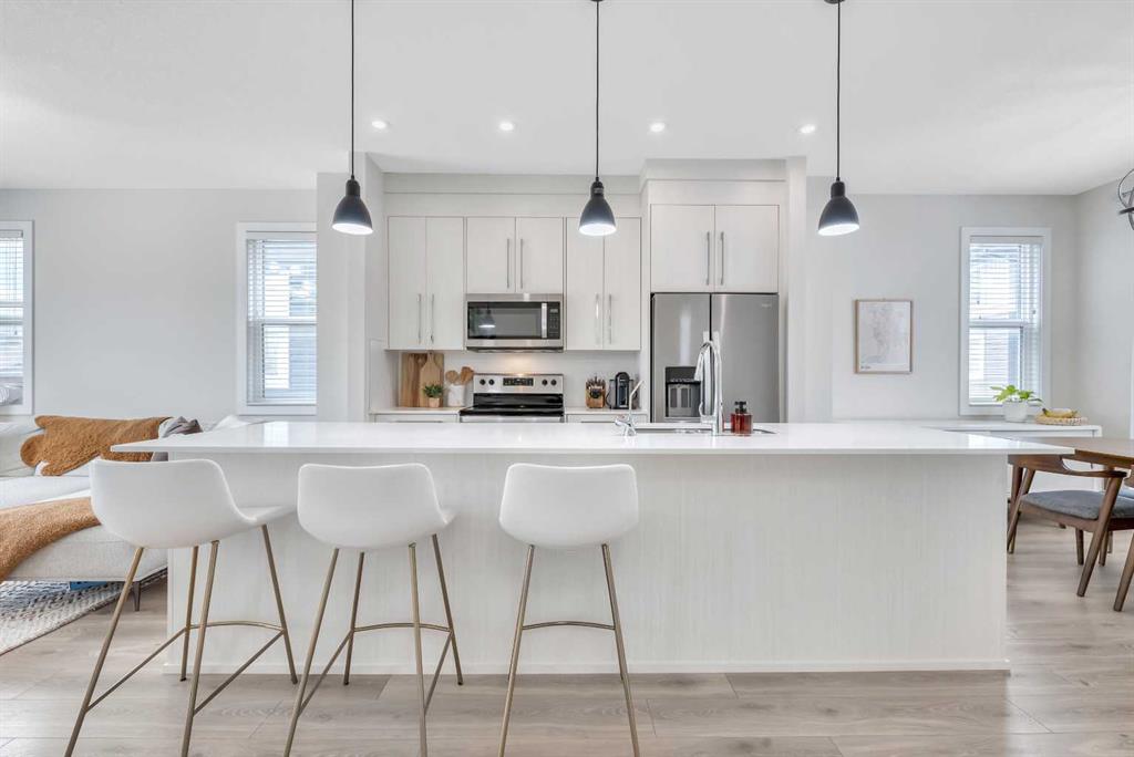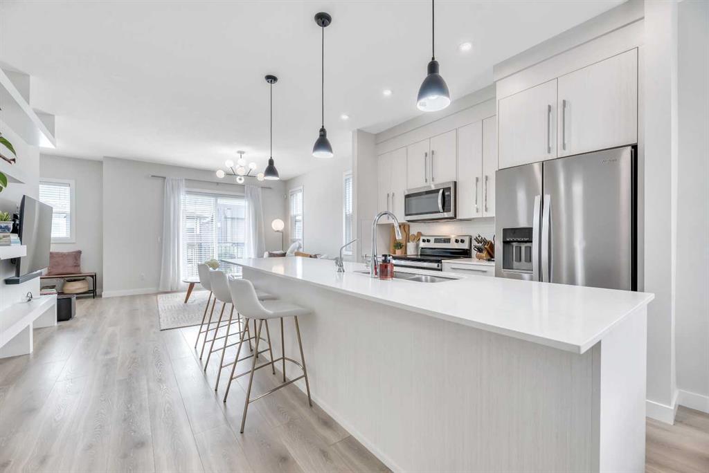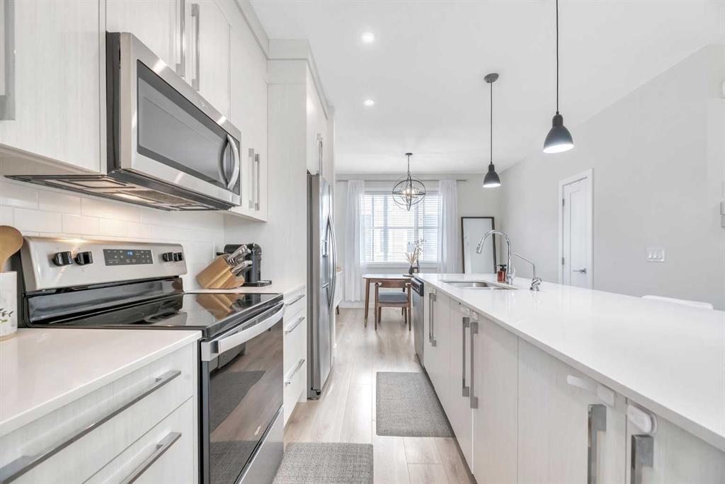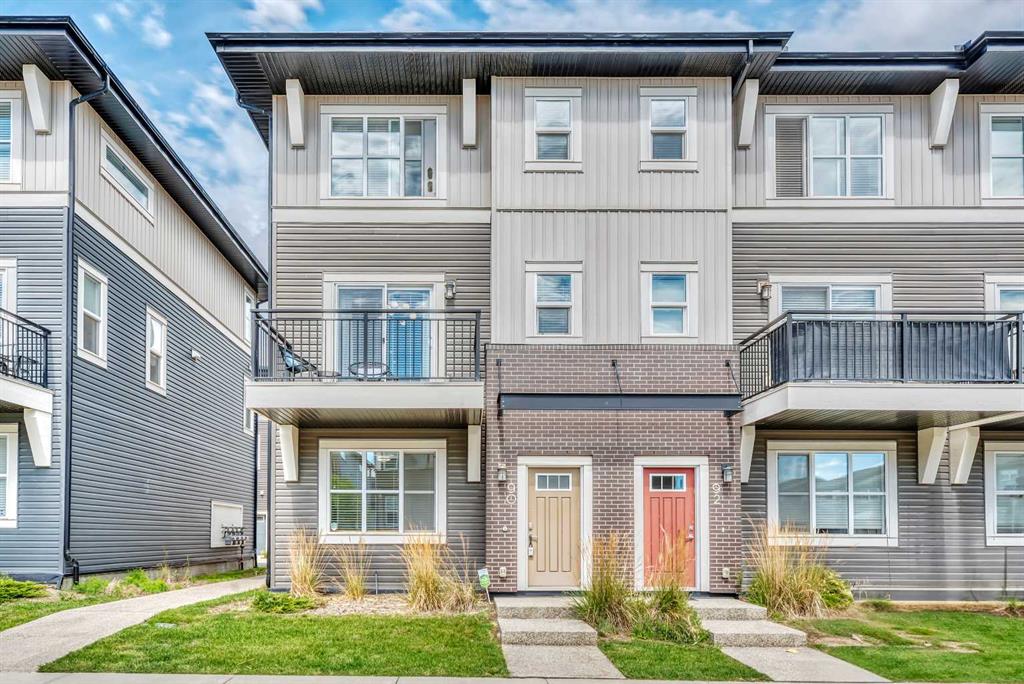 Welcome to this stunning 3 BEDROOM 2.5 BATH CORNER END UNIT Townhouse, which comes with a HUGE HEATED DOUBLE ATTACHED GARAGE and a SOUTH-FACING balcony!!! Upon entry, you will be greeted by an entryway leading to a spacious bedroom, a mudroom closet, and the double attached garage-where you can find the utility room. The second floor offers a great open-concept floor plan that includes the dining area, kitchen, living area, corner office space, a half bath, and the balcony. The kitchen is equipped with stainless steel appliances, quartz countertops, a long kitchen island, and a well-sized pantry. The top floor boasts TWO LARGE AND COZY MASTER BEDROOMS WITH EACH ROOM HAVING ITS OWN WALK-IN CLOSET AND ITS OWN ENSUITE BATHROOM!!! The washer and dryer is also located on the top floor for added convenience. Since this is a corner end unit, you will have the luxury of having extra windows that allow ample amount of outdoor light indoors-making this home bright and airy. In the balcony, you will find a gas line for your barbecue grill as an added bonus. There is plenty of street parking for your guests just steps away from this home's front door, as well as a number of free visitor's parking when you drive inside the complex. This home is close to bus stops, schools, parks, restaurants, and Shopping Centres; as well as it offers easy access to Stoney Trail for fast and easy commute. Don't miss the opportunity to make this beautiful home yours!!!