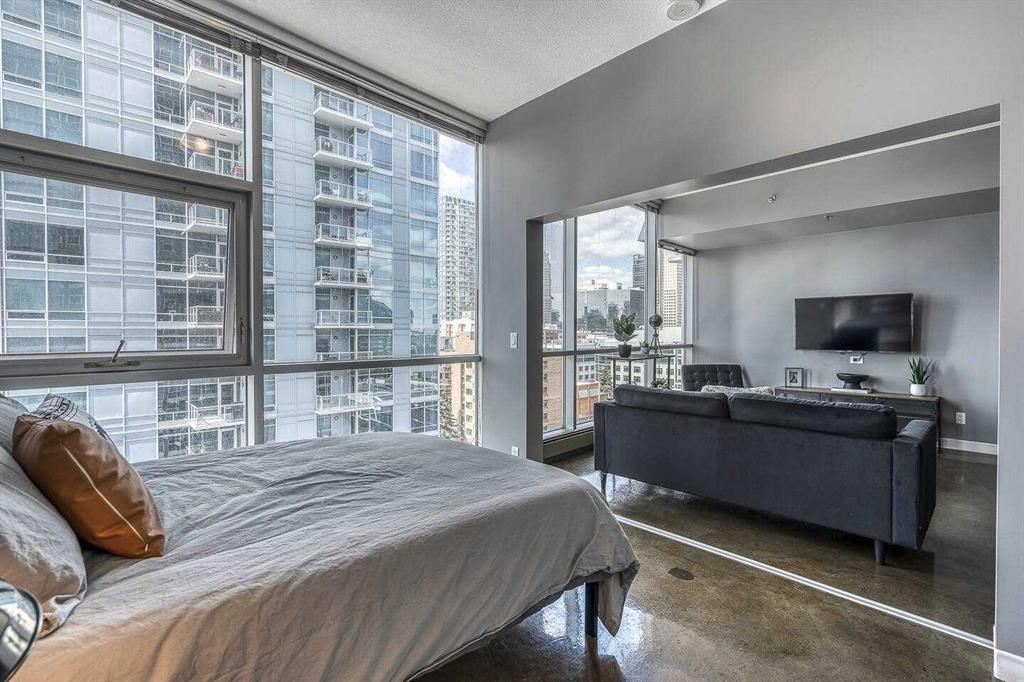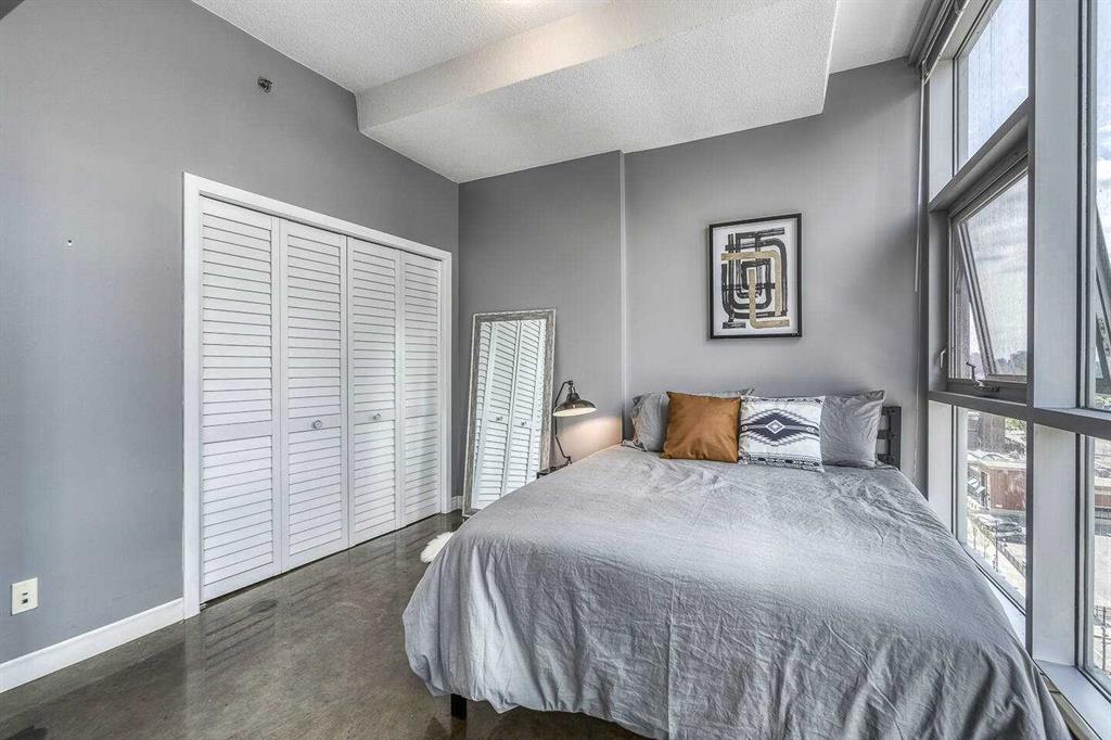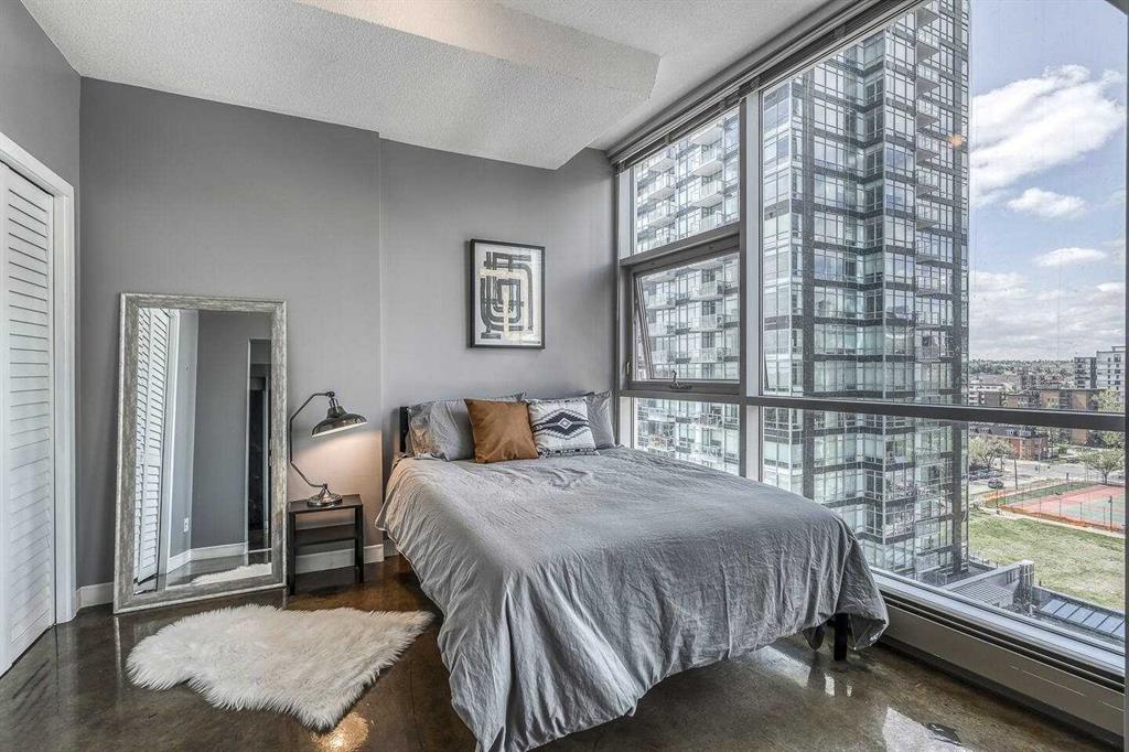 An incredible opportunity to own a thriving Airbnb with all furniture and furnishings included in Calgary's vibrant Downtown Beltline District! Bathed in natural sunlight, this stunning West-facing residence in the highly coveted, Colours by Battistella building effortlessly blends industrial style with contemporary elegance. Boasting 2 bedrooms and 1 bathroom, this unit features soaring 9-foot ceilings, polished concrete floors, and dramatic steel-framed floor-to-ceiling windows that frame incredible city views. The sleek kitchen is a delight with granite countertops and stainless-steel appliances, while conveniences such as in-suite laundry and central A/C ensure year-round comfort. As an established Airbnb property, this unit allows you to seamlessly take over the reins and continue reaping the rewards of this venture. Perfectly positioned in the vibrant Victoria Park neighborhood, you’ll be just moments from downtown, Calgary Stampede Grounds, the Bow River, 17th Ave, and an array of Calgary’s trendiest spots—including Starbucks, Ten Foot Henry, and Proof—plus endless dining, nightlife, and entertainment options, all with public transit at your doorstep.