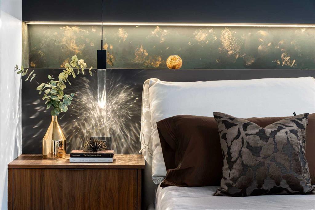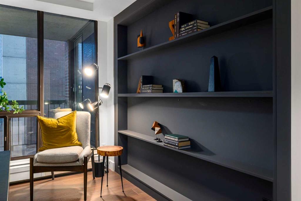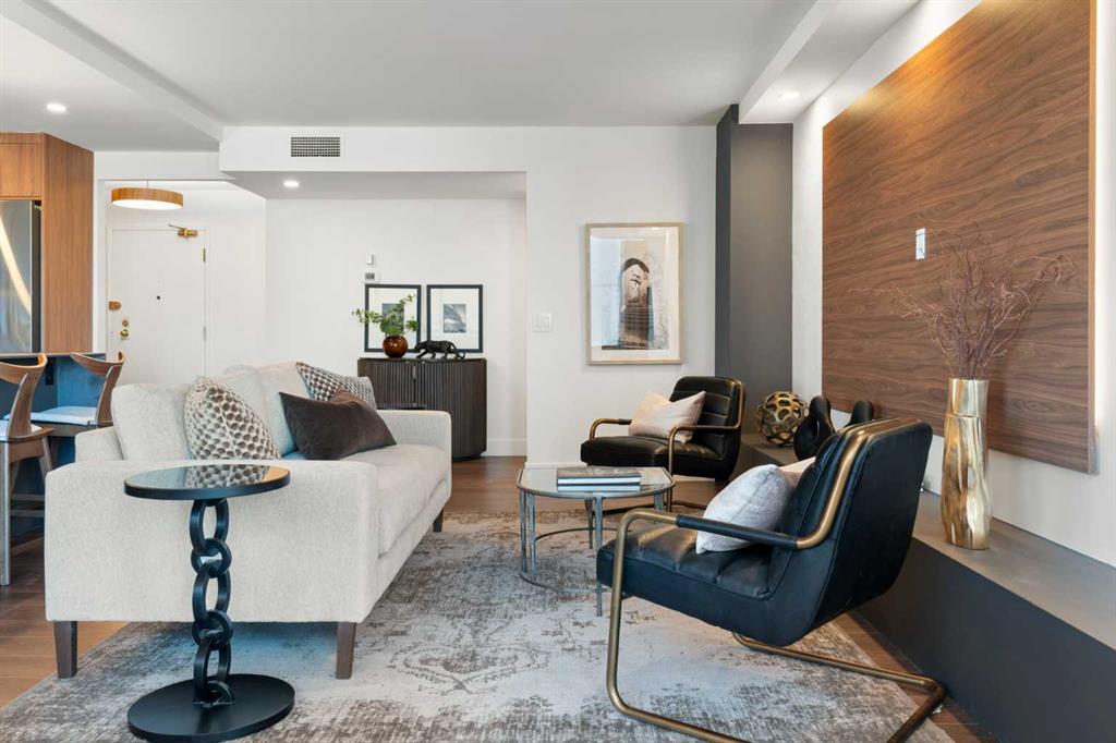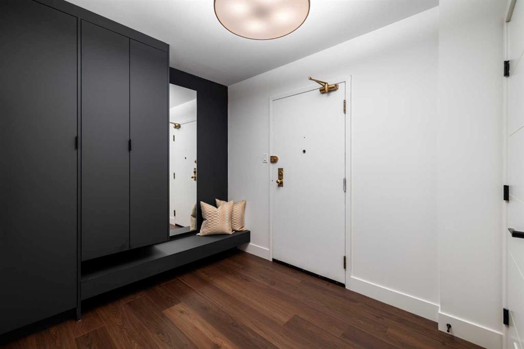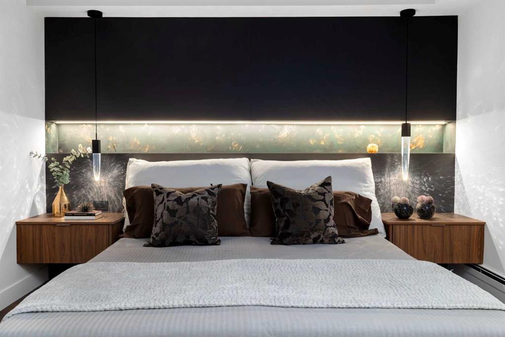 The den offers an inspiring setting to work from home by day and a cozy retreat by night, softly illuminated by the glow of city lights. A luxurious three-piece bathroom showcases striking 2x4 tilework and refined fixtures. A sleek laundry closet is discreetly tucked away for convenience. The principal bedroom comfortably fits a king-sized bed and features an artist hand-painted feature wall with gold accents, adding a touch of bespoke elegance to the serene atmosphere. Enjoy tranquil river and mountain views complimented by the vibrancy of the city. A walk-in closet and beautiful four-piece ensuite complete this restful retreat. The second bedroom is equally impressive, offering a dramatic downtown skyline view. Step onto the private deck from the living or dining area and take in the ever-changing cityscape. Design details throughout include Delta faucets, statement lighting furnished by Cartwright Lighting, and luxury Coretec vinyl plank flooring, blending comfort and high design seamlessly.Roxboro House remains one of Calgary’s most distinguished addresses, offering 24-hour concierge and security, premium amenities including a pool, fitness centre, and social spaces, and an unbeatable riverfront location in the heart of Mission. This residence includes ample in-suite storage, a secure locker, and convenient parking, all accessible by two elevators.
