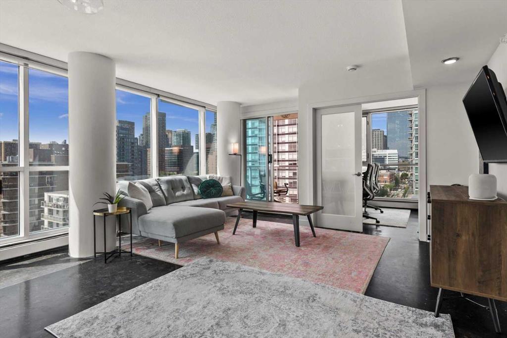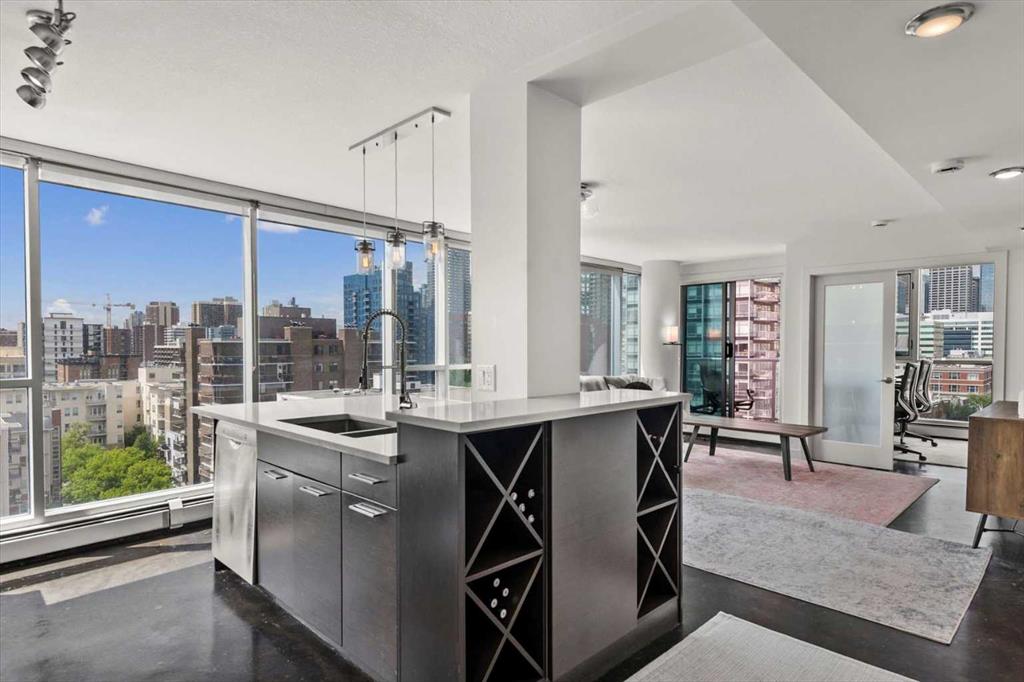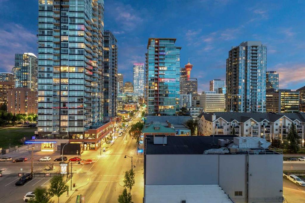 *CHECK OUT 360 VIRTUAL TOUR* West-Facing, Corner Unit with Modern Upgrades & Central A/C! Soak in the incredible downtown views from this sleek 2 bedroom condo, where floor-to-ceiling windows bring the city skyline right into your living room. Located in The Chocolate building in the heart of The Beltline, enjoy the ultimate urban lifestyle just off 1st Street and 17th Ave, offering incredible restaurants, cocktail bars, and coffee shops, all while just a short distance from the Calgary Saddledome and Stampede Park. Designed for both comfort and style, the open-concept layout features polished concrete floors and a fully upgraded kitchen complete with quartz countertops, sleek stainless steel appliances, bright cabinetry, and a large island offering plenty of space to host and entertain. The main living area is the perfect spot to relax and enjoy the city views with floor-to-ceiling windows throughout. Wake up each morning to breathtaking views of the iconic Calgary Tower, perfectly framed from your NW facing patio, the ideal spot to enjoy your morning coffee, or enjoy evening BBQs. The second bedroom offers versatile space, perfect for a comfortable home office or guest room. The updated 4-piece bathroom features a sleek modern vanity and ample storage. Additional features include in-suite laundry, a titled underground parking stall, complimentary bike storage, and a common courtyard patio for you to enjoy during the summer months. Whether you're a first-time buyer, urban professional, or investor, this condo delivers exceptional value and an unbeatable location!